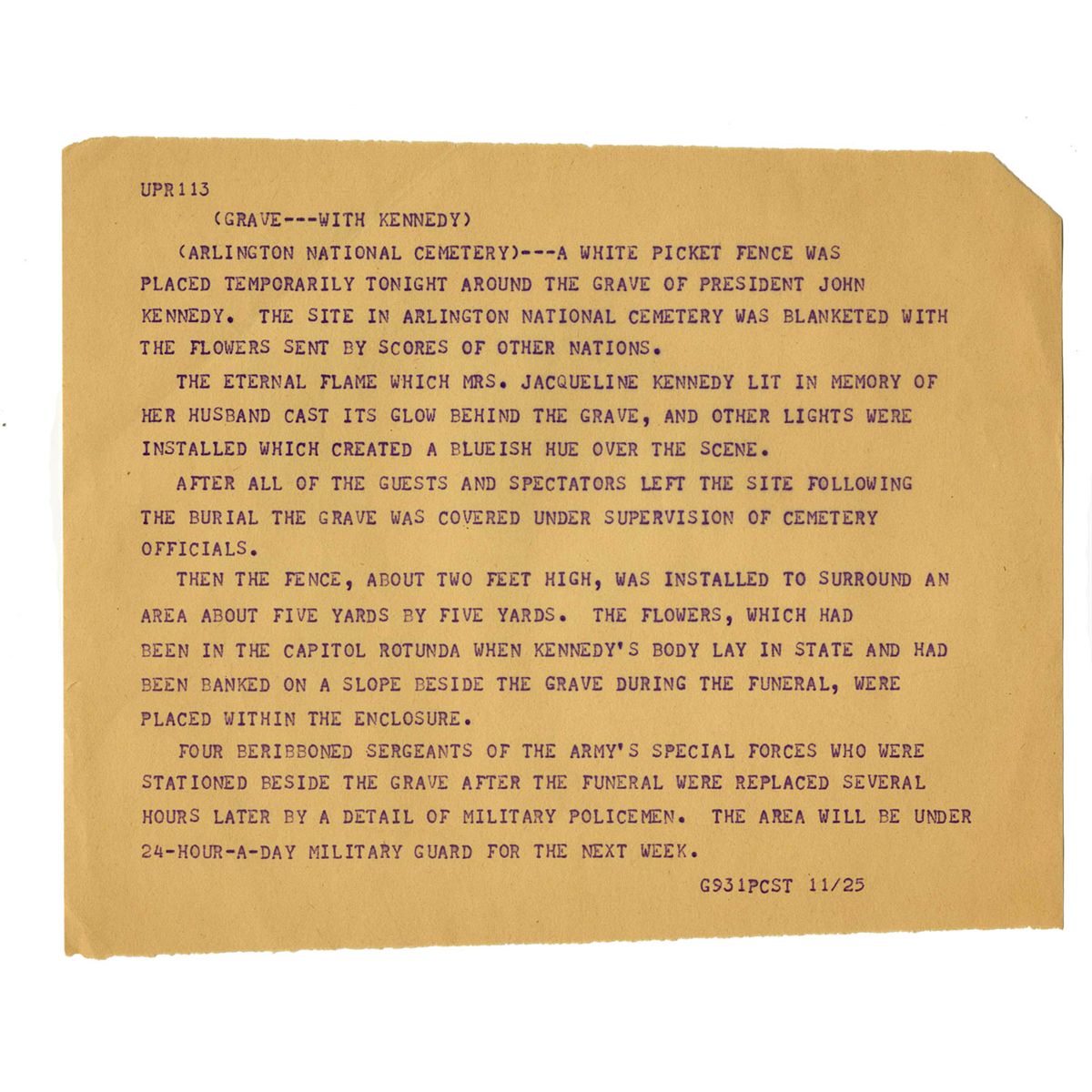 Teletype detailing the somber scene of John F. Kennedy's burial at Arlington National Cemetery. One page teletype reads in part: ''...A white picket fence was placed temporarily tonight around the grave of President John Kennedy. The site in Arlington National Cemetery was blanketed with the flowers sent by scores of other nations. The eternal flame which Mrs. Jacqueline Kennedy lit in memory of her husband cast its glow behind the grave...'' Teletype, measuring 8.5'' x 7'', has folded top right edge, else near fine.
