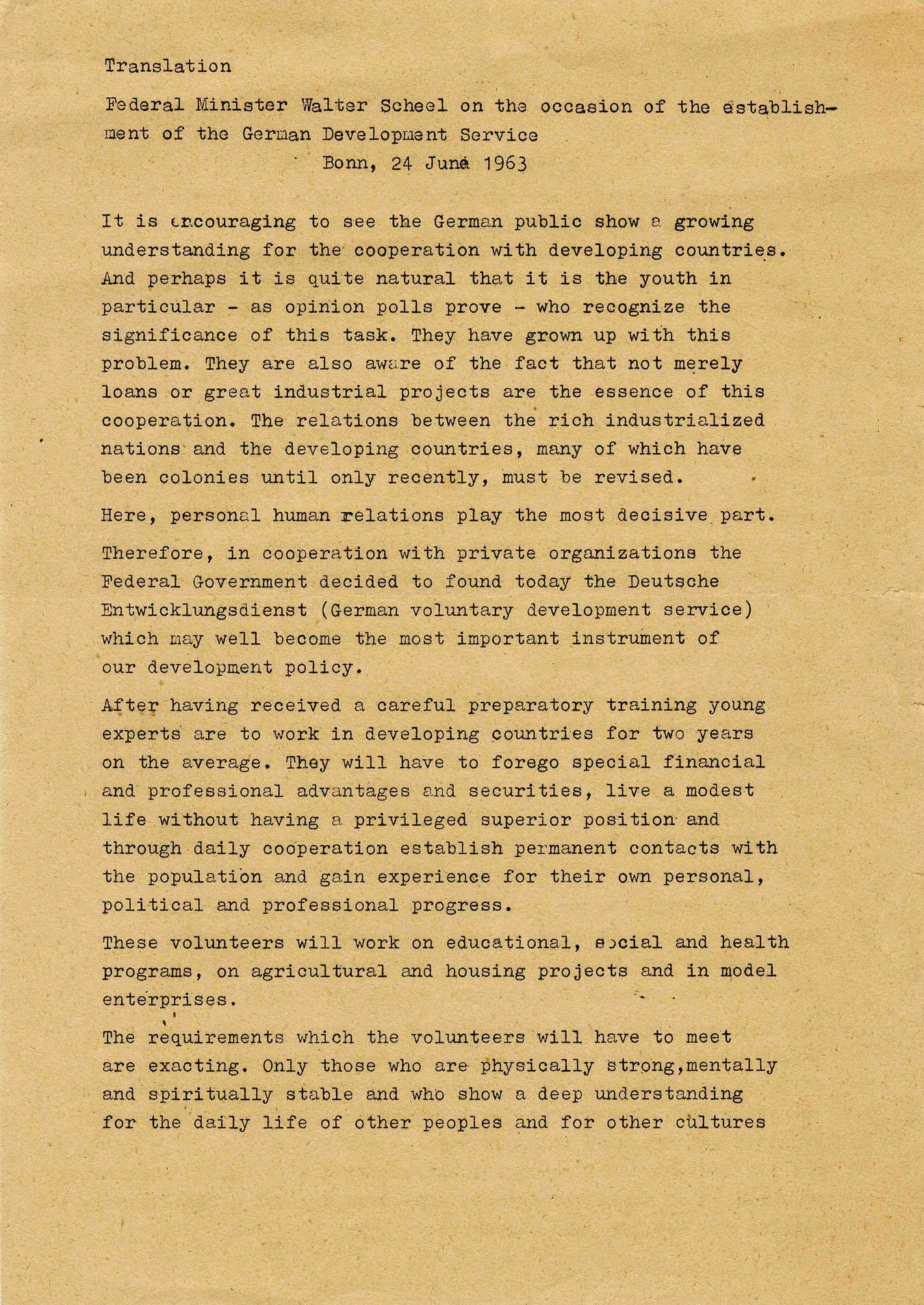 President John F. Kennedy's original translation document from his historic Germany trip. Dated 24 June 1963, Federal Minister Walter Scheel speaks on the occasion of the establishment of the German Development Service, expressing great hope for world peace. Single page measures 8.5'' x 11''. Minor creasing, single fold and minor tear at fold to right margin, else fine. From the Robert White collection.