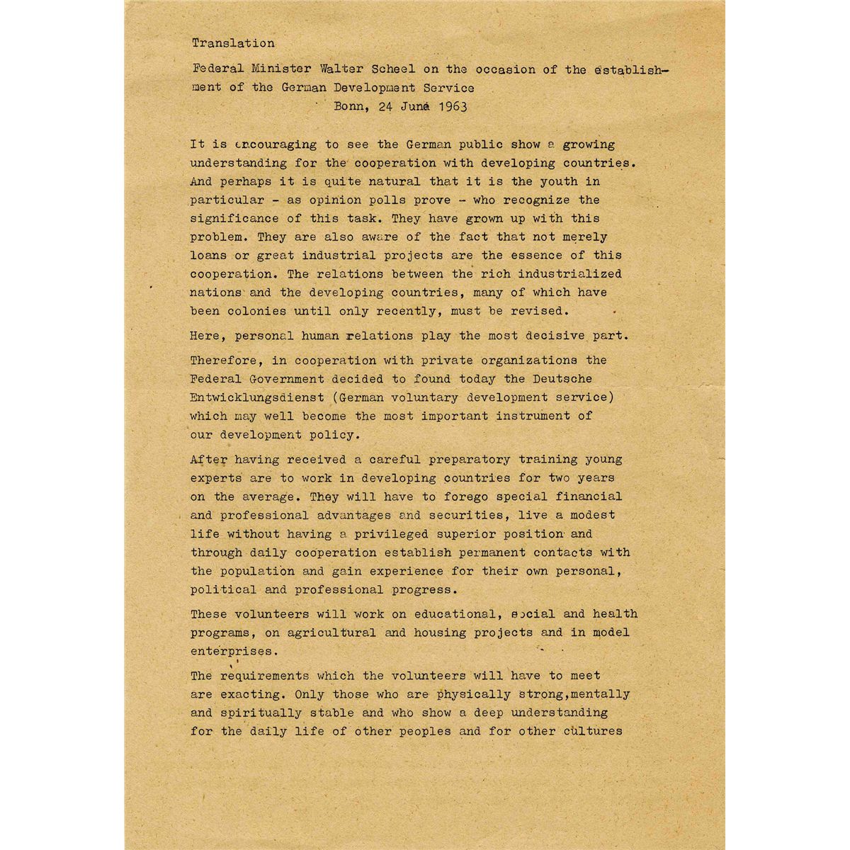 President John F. Kennedy's original translation document from his historic Germany trip. Dated 24 June 1963, Federal Minister Walter Scheel speaks on the occasion of the establishment of the German Development Service, expressing great hope for world peace. Single page measures 8.5'' x 11''. Minor creasing, single fold and minor tear at fold to right margin, else fine. From the Robert L. White JFK collection.