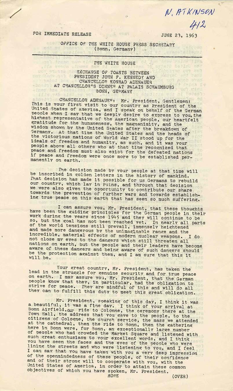 Original press release issued by the John F. Kennedy administration on the occasion of JFK's trip to Germany. Dated 23 June 1963, document transcribes the toasts delivered by Kennedy and Chancellor Adenauer, where both gentlemen praise the works of the other in promoting world peace. Kennedy remarks, ''I believe that our task in 1963 is to sustain an alliance through a long period of what may appear superficially to be relative calm.'' Three page release measures 8.5'' x 14''. Writing to upper right corner of first page, else near fine.