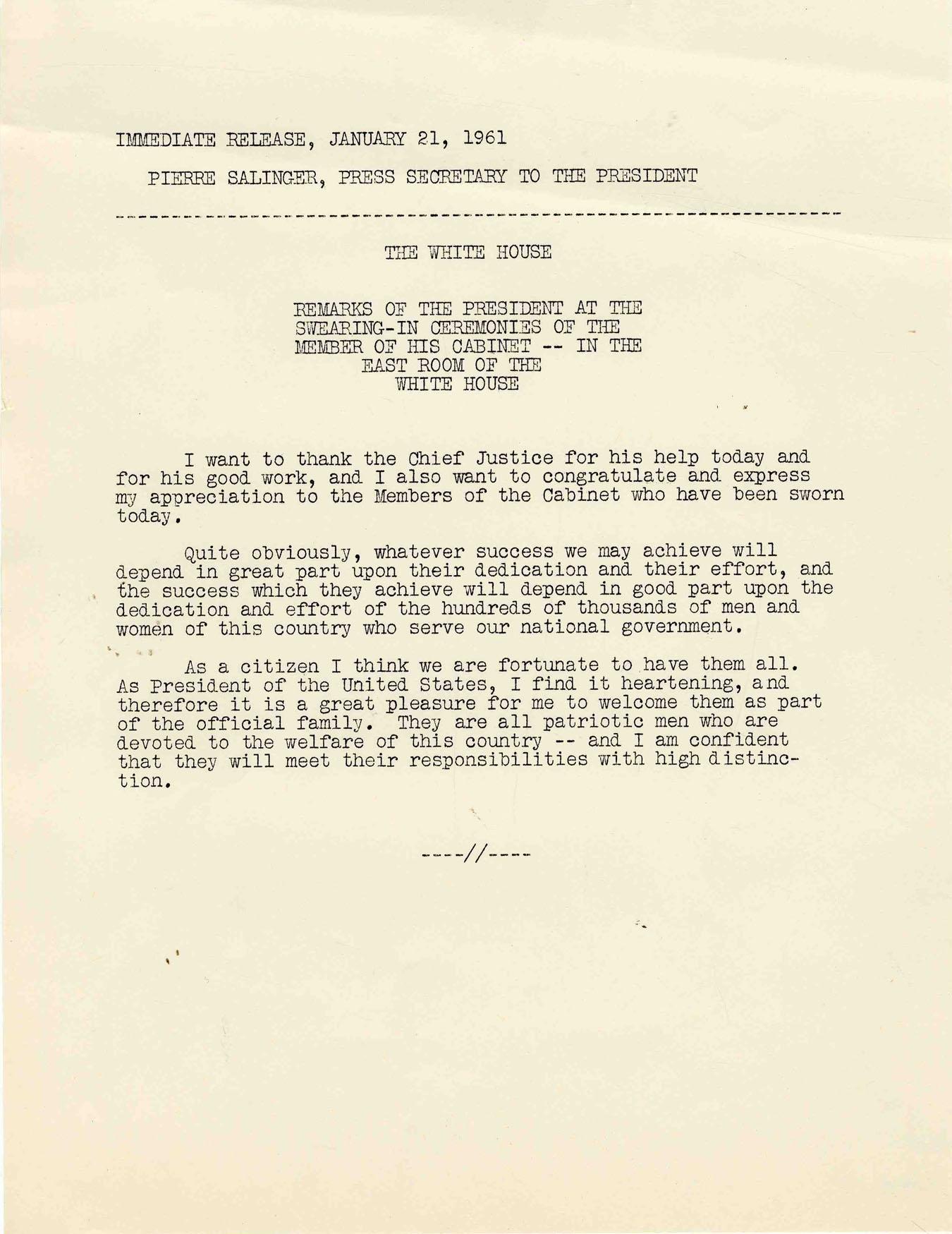 Original press release by Pierre Salinger, Press Secretary to President John F. Kennedy, dated 21 January 1961 upon the President's inauguration. Entitled ''Remarks of the President at the Swearing-in Ceremonies of the Member of His Cabinet,'' release reads in part, ''…I find it heartening, and therefore it is a great pleasure for me to welcome them as part of the official family. They are all patriotic men who are devoted to the welfare of this country…'' Single page document measures 8.5'' x 11''. Near fine condition.