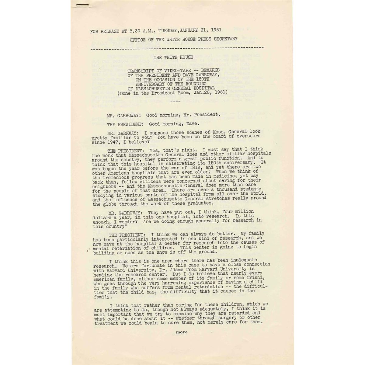Original transcript from the Office of the White House Press Secretary for President John F. Kennedy. Dated 31 January 1961 just after assuming office, Kennedy is interviewed on the anniversary of Massachusetts General Hospital. Kennedy speaks at length about medical progress and research, and physical fitness for children. Three page document measures 8.5'' x 14''. Very good condition.
