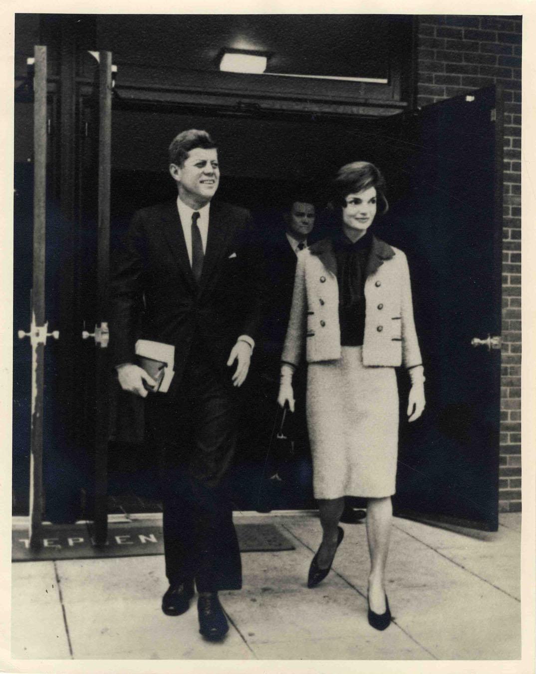 President John F. Kennedy with First Lady Jackie Kennedy photo. Original image was never published and depicts the beloved couple, smiling, with secret service in the background. Dress suit worn by Mrs. Kennedy is the infamous pink suit worn in Dallas on the tragic occasion of her husband's assassination. The First Lady rarely wore the same outfit twice, so it is likely that this photo was shot on that fateful day. Black and white matte, 8'' x 10''. No creasing, near fine condition.