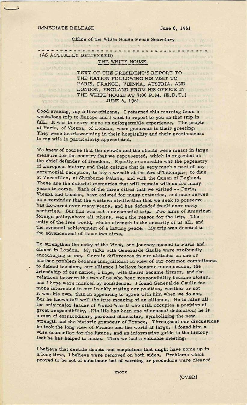 Advance copy of President John F. Kennedy's 6 June 1961 prime time television address about his foreign policy trip to Paris, Vienna and London. The speech, a mimeograph made from the original typed sheet, reads in part, ''...Two aims of American foreign policy, above all others, were the reason for the trip: the unity of the free world, whose strength is the security of us all, and the eventual achievement of a lasting peace...'' 5pp. on 8'' x 13.75'' sheets have light toning and a staple at top left corner. Very good condition.