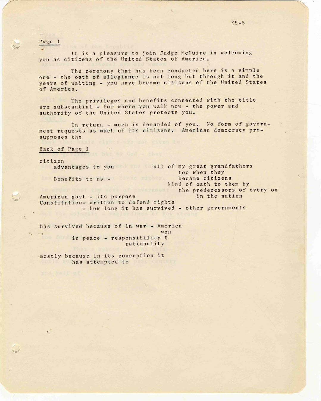 Personal copy of John F. Kennedy's naturalization speech from his Senate files. Speech reads in part: ''It is a pleasure to join Judge McGuire in welcoming you as citizens of the United States of America...in taking that oath you follow in the footsteps of an illustrious company who like you came here to this great country to build homes and raise their families...'' Three pages measure 8.5'' x 11''. Three hole punched to left margin, otherwise near fine condition.