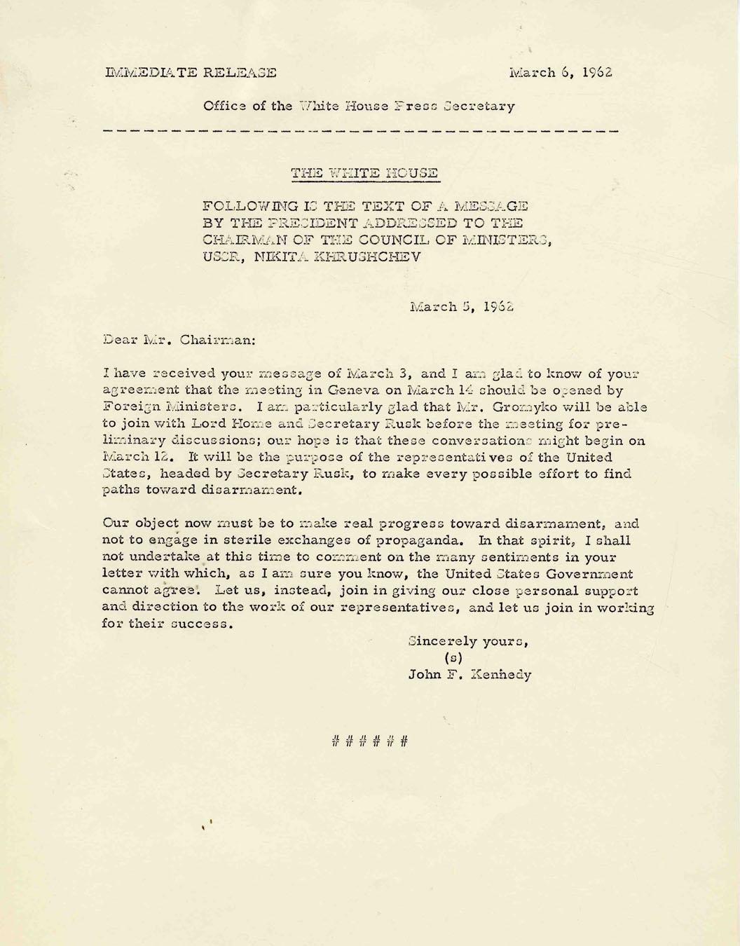 Original press release with remarks by JFK to Khrushchev from the Office of the White House Press Secretary dated 5 March 1962. JFK expresses hope for upcoming talks to be held in Geneva: ''…our object now must be to make real progress toward disarmament, and not to engage in sterile exchanges…let us join in giving our close personal support and direction…'' Single page measures 8.5'' x 11''. Paper clip crease to upper left corner, else fine.