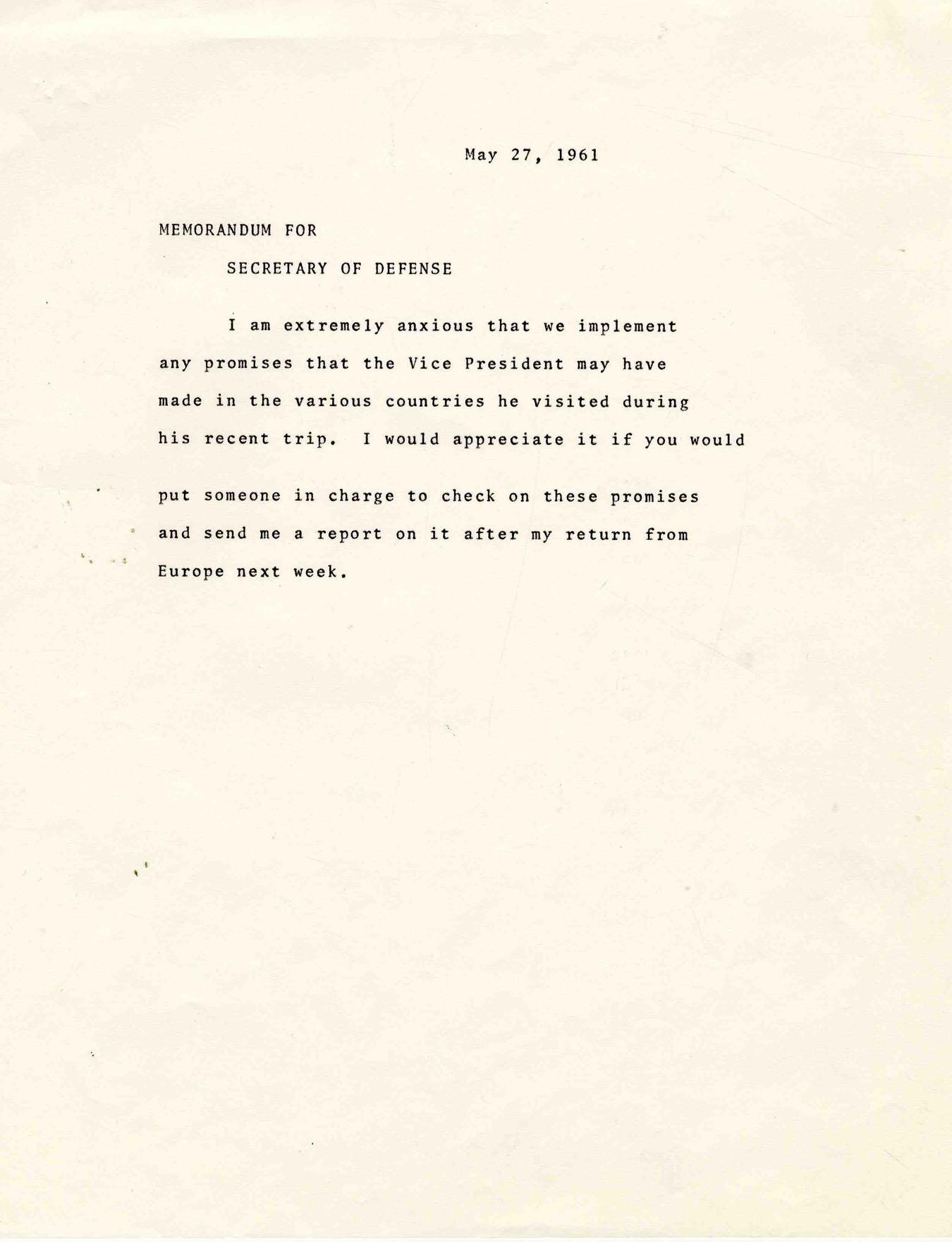 Interesting original memo from the JFK Administration dated 27 May 1961, on watermarked government paper. ''Memorandum for Secretary of Defense'' reads, ''I am extremely anxious that we implement any promises that the Vice President may have made in the various countries he visited during his recent trip, put someone in charge to check on these promises and send me a report on it after my return from Europe next week.'' 8.5'' x 11'' document in near fine condition. From the Evelyn Lincoln collection.