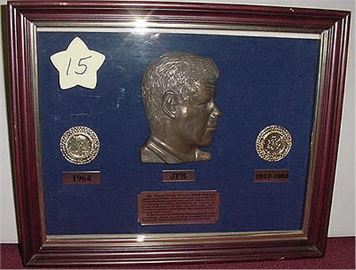 JFK Memorial 16x13 Shadow Box Frame w/ Bust & 2 Gold Layered Coins in Bezels