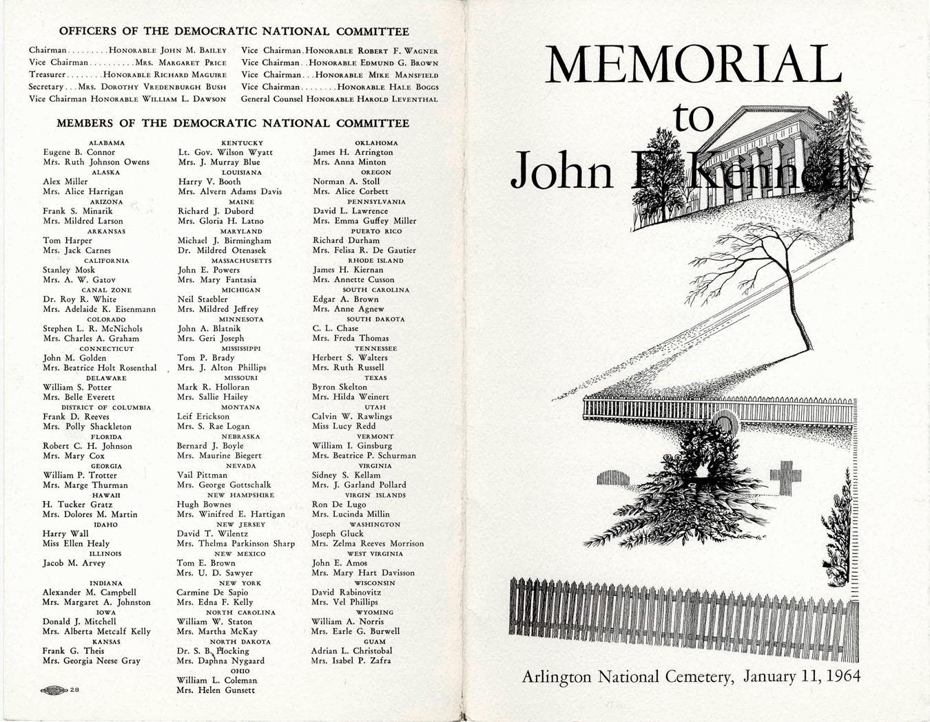 Original JFK memorial program for services held at Arlington National Cemetery on 11 January 1964. Front cover art is a mournful black ink sketch and interior text reads ''…members and officers of the Democratic National Committee said a prayer beside the grave of the 35th President…'' One page, card style. Measures 11'' x 8.5'' when open. Excellent condition.