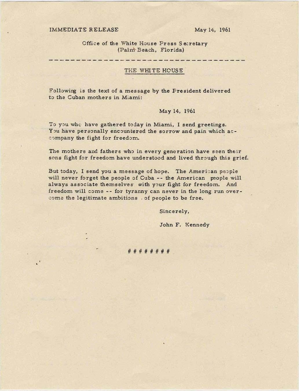 Text of President John F. Kennedy's message to ''Cuban mothers in Miami'' dated 14 May 1961. Released by the Office of the White House Press Secretary, address reads in part, ''Today, I send you a message of hope. The American people will never forget the people of Cuba; the American people will always associate themselves with your fight for freedom. And freedom will come, for tyranny can never in the long run overcome the legitimate ambitions of people to be free.'' 8.5'' x 11'' document has light toning, else near fine.