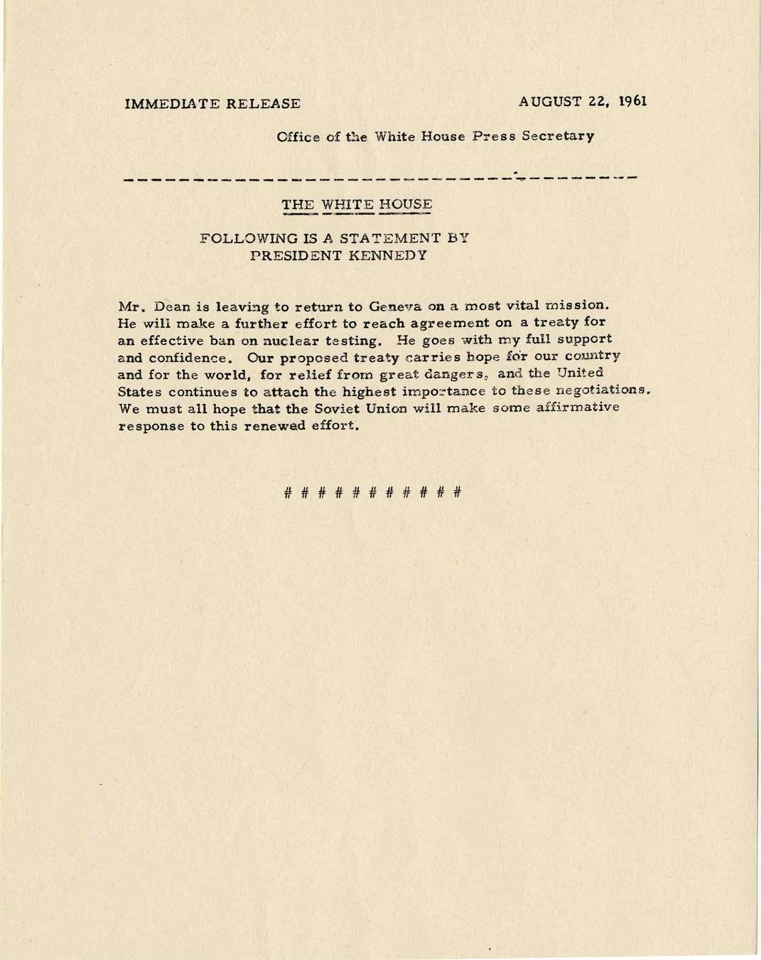 Original document with remarks made by John F. Kennedy released by the Office of the White House Press Secretary dated 22 August 1961. JFK states his support for a nuclear test ban treaty with the Soviet Union as Ambassador Arthur H. Dean travels to Geneva. Reads in part, ''Our proposed treaty carries hope for our country and for the world, for relief from great dangers…'' Single page measures 8.5'' x 11''. Fine condition.
