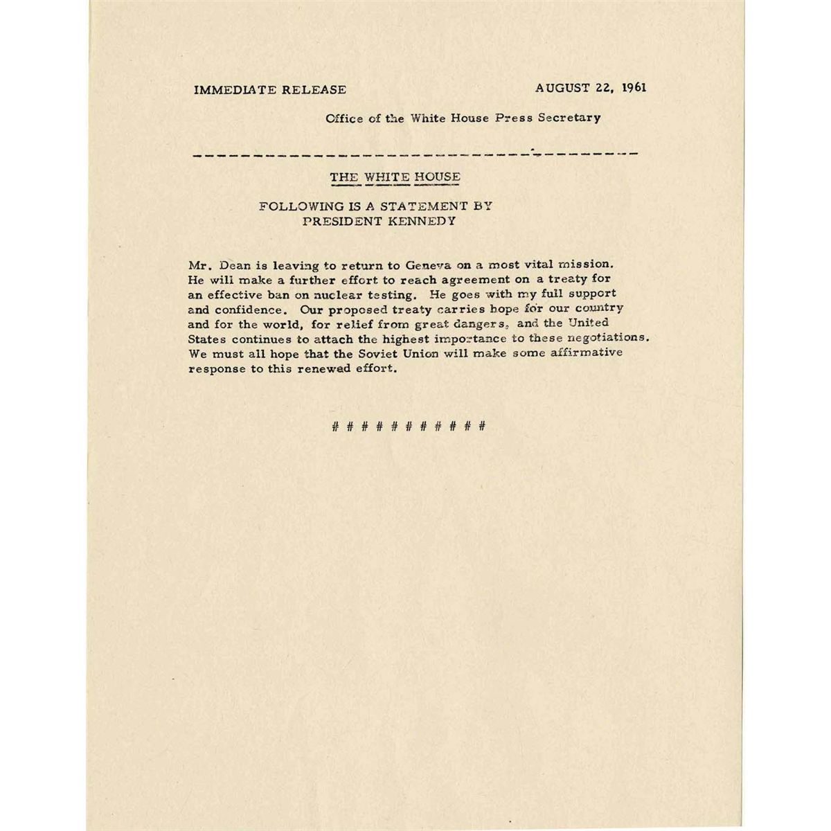 Original document with remarks made by John F. Kennedy released by the Office of the White House Press Secretary dated 22 August 1961. JFK states his support for a nuclear test ban treaty with the Soviet Union as Ambassador Arthur H. Dean travels to Geneva. Reads in part, ''Our proposed treaty carries hope for our country and for the world, for relief from great dangers…'' Single page measures 8.5'' x 11''. Fine condition.