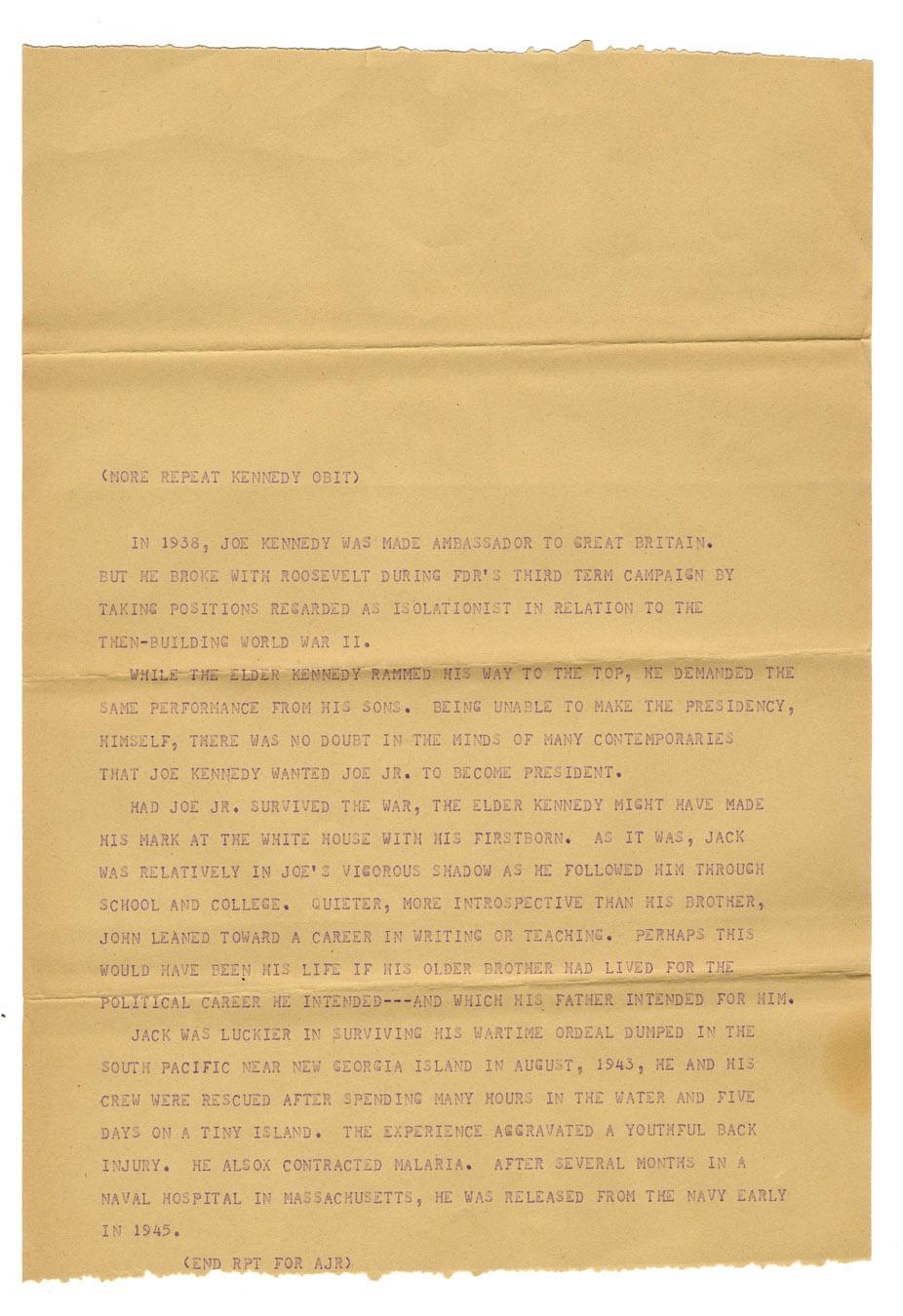 Fascinating teletype, with partial JFK obituary, discussing Joe Kennedy's political aspirations for himself and his sons. One page teletype reads in part: ''…Being unable to make the presidency, himself, there was no doubt in the minds of many contemporaries that Joe Kennedy wanted Joe Jr. to become president…Had Joe Jr. survived the war, the elder Kennedy might have made his mark at the White House with his first son…'' Teletype, measuring 8.5'' x 12'', has three horizontal folds and ragged top and bottom edges. Near fine.