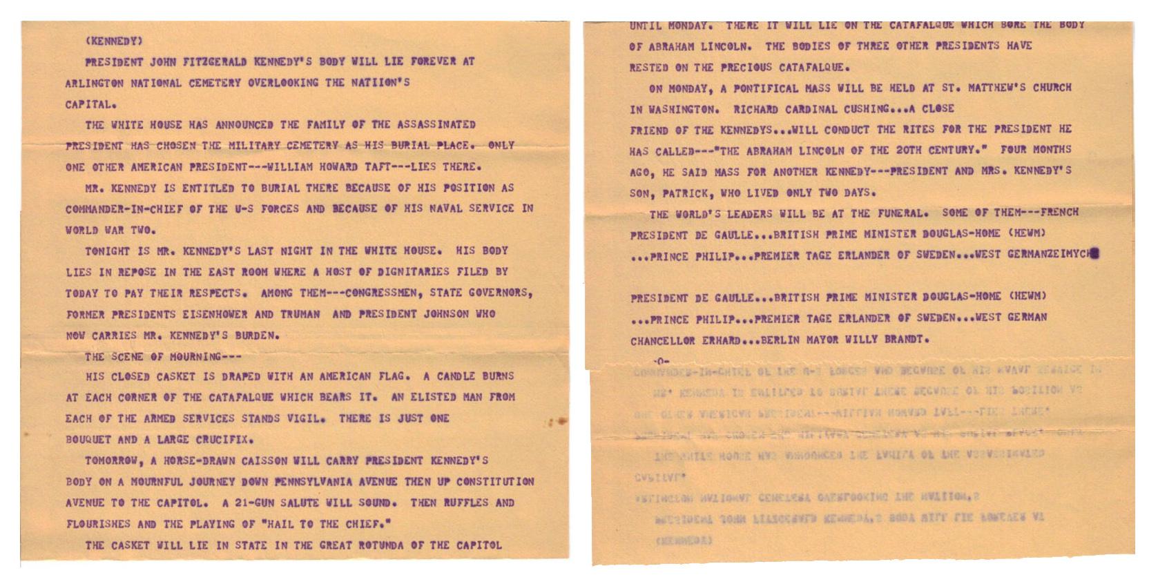 John F. Kennedy teletype, with partial obituary detailing the President's decorated family history, including their remarkable success in motion pictures, the stock market, real estate and scotch whiskey. Teletype reads in part: ''…Joe Kennedy was brought into the government as first chairman of the Securities and Exchange Commission (SEC), which astonished many brokers who had felt the crunch of Joe's heel on their necks in tough stock market deals…'' Measuring 8.5'' x 10.5'', one page teletype has three horizontal folds. Very good.