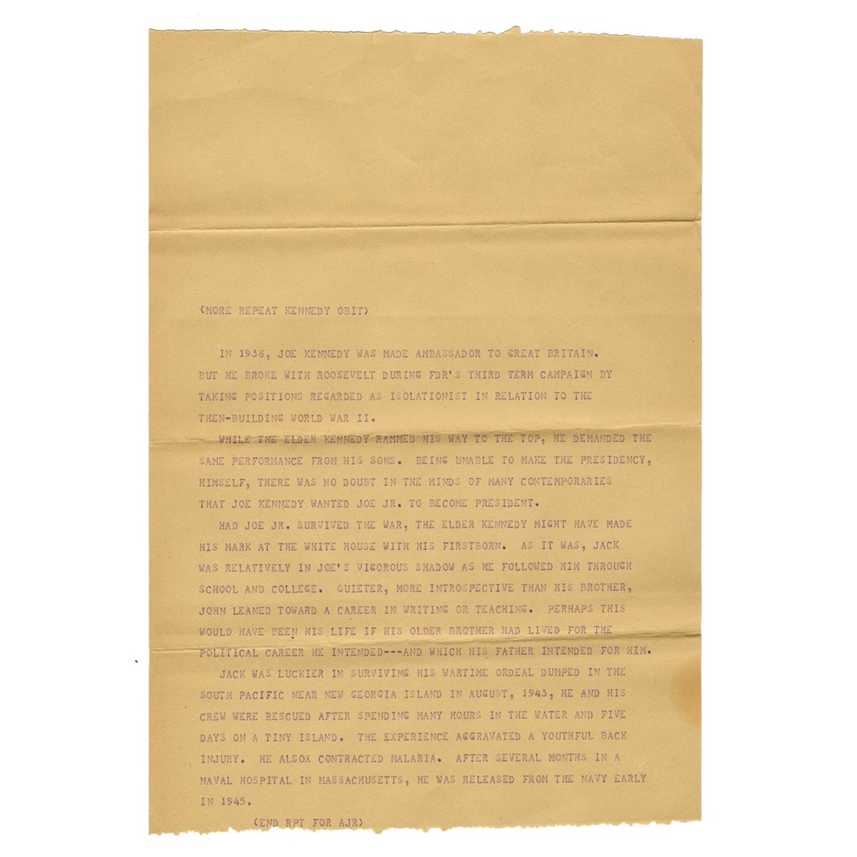 Fascinating teletype, with partial JFK obituary, discussing Joe Kennedy's political aspirations for himself and his sons. One page teletype reads in part: ''...Being unable to make the presidency, himself, there was no doubt in the minds of many contemporaries that Joe Kennedy wanted Joe Jr. to become president...Had Joe Jr. survived the war, the elder Kennedy might have made his mark at the White House with his first son...'' Teletype, measuring 8.5'' x 12'', has three horizontal folds and ragged top and bottom edges. Near fine.