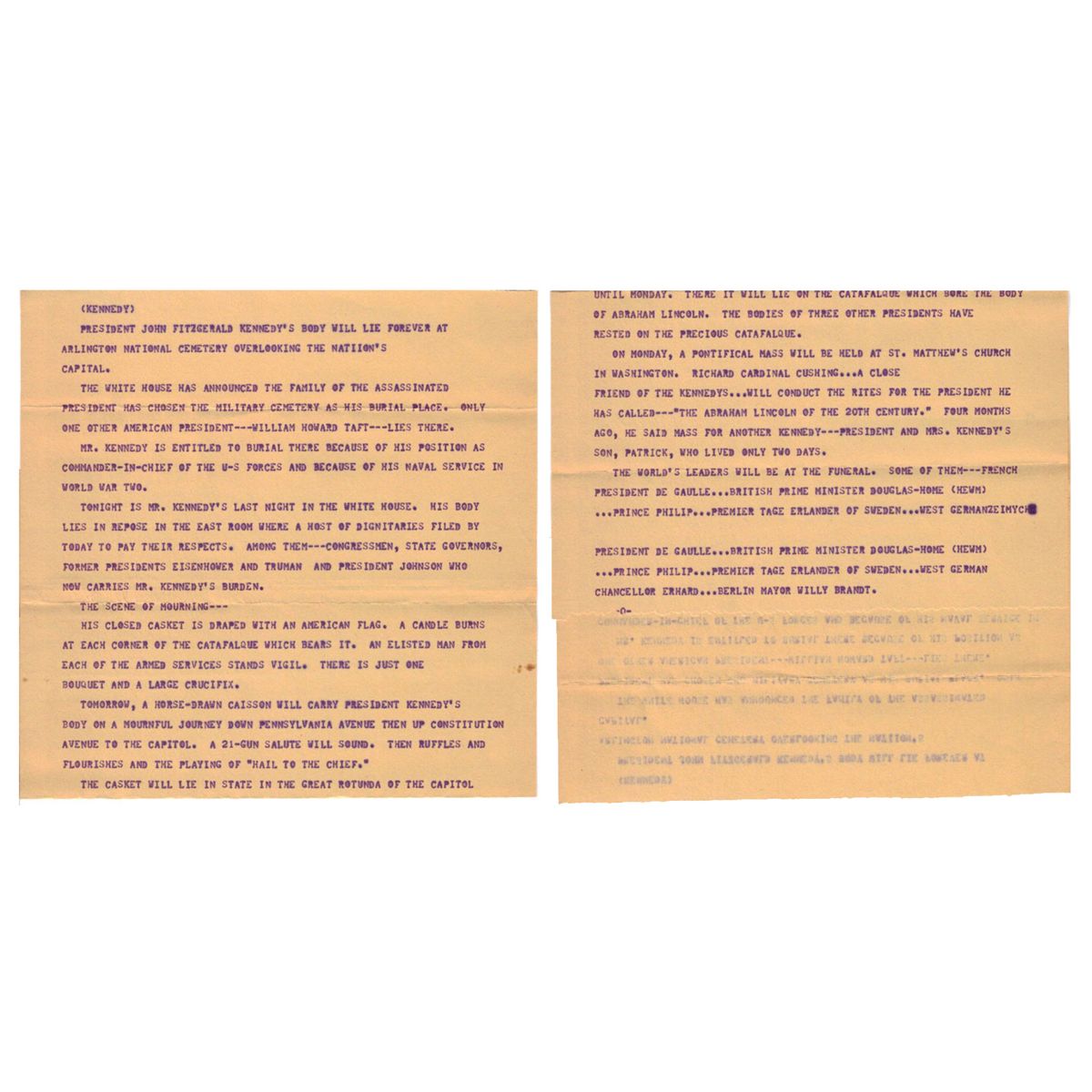 John F. Kennedy teletype, with partial obituary detailing the President's decorated family history, including their remarkable success in motion pictures, the stock market, real estate and scotch whiskey. Teletype reads in part: ''...Joe Kennedy was brought into the government as first chairman of the Securities and Exchange Commission (SEC), which astonished many brokers who had felt the crunch of Joe's heel on their necks in tough stock market deals...'' Measuring 8.5'' x 10.5'', one page teletype has three horizontal folds. Very good.
