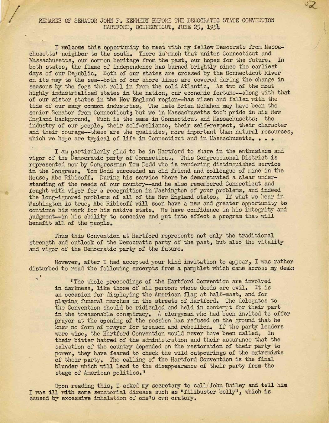 Original speech owned by Senator John F. Kennedy, delivered by him on 25 June 1954 at the Democratic State Convention in Hartford, Connecticut. Seven-page speech reads in part, ''...the great expectations the American people have not been fulfilled.The problems of twilight wars cannot be dissipated overnight, but require...honest leadership.'' Speech measures 8.5'' x 11''. Staple at top left, and light toning, else near fine. From the Robert L. White JFK collection, obtained from JFK's Senate files.