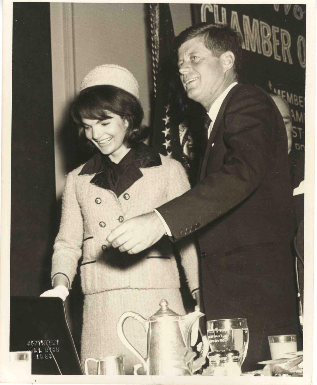 President John F. Kennedy photograph captured just hours before his assassination. Original black and white image of President and Mrs. Kennedy taken at the Fort Worth Chamber of Commerce breakfast on 22 November 1963. A true original printed from the original negative in 1963 by photographer Bill Rich. Photo embossed to lower left corner ''Copyright / Bill Rich / 1963.'' Photo measures 8” x 10”. A beautiful image of the President in his last hours.