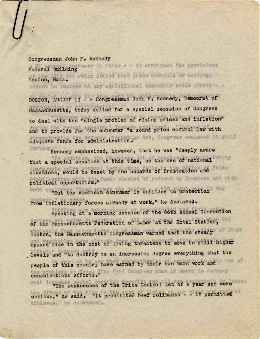 Original statement from the office of Congressman John F. Kennedy on inflation and the minimum wage. In this three page document typed on onion paper datelined Boston, 13 August [1952], Kennedy declares, ''The American consumer is entitled to protection from inflationary forces...Congress...must lift the minimum wage from seventy-five cents an hour and increase its coverage in industries...''Original paper clip binds 8.5'' x 11'' pages which are lightly toned. From the Robert L. White Collection. Very good condition.