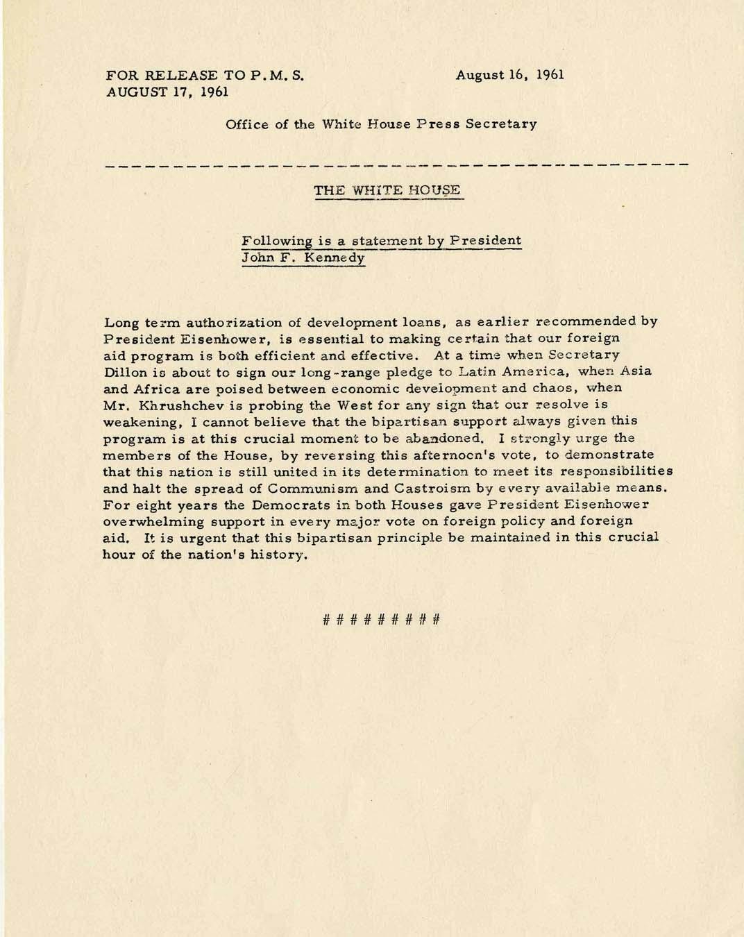 Original White House press release from John F. Kennedy, urging Congress to reverse itself on a vote which gave the legislative branch broad control over JFK's lending powers to foreign countries. In part, ''I strongly urge the members of the House, by reversing this afternoon's vote [a key amendment to that year's foreign aid bill], to demonstrate that this nation is still united in its determination to meet its responsibilities and halt the spread of Communism and Castroism by every available means.'' 8.5'' x 11''. Near fine condition.