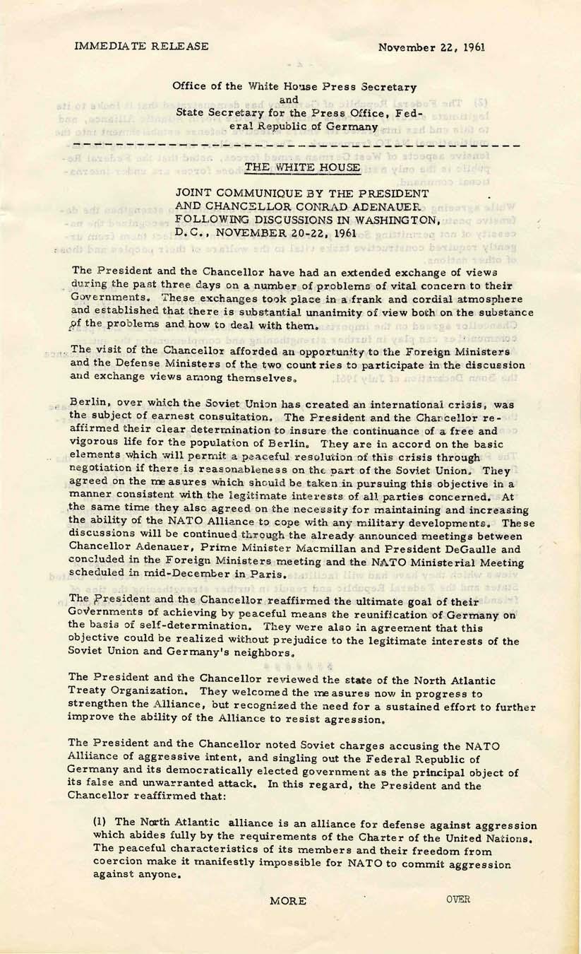 White House press release dated 22 November 1961 regarding President Kennedy's Cold War conference with West German Chancellor Conrad Adenauer in Washington. Reads in part, ''…The President and the Chancellor have had an extended exchange of views during the past three days on a number of problems of vital concern to their Governments…Berlin, over which the Soviet Union has created an international crisis, was the subject of earnest consultation.'' Two pages on single 8.5'' x 14'' sheet has folds and creasing, otherwise fine.
