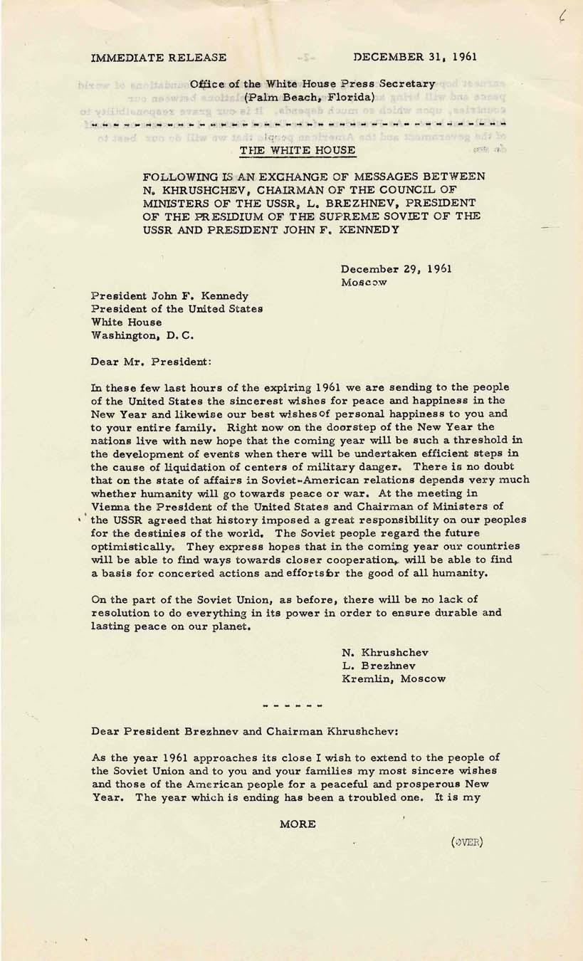 Original 31 December 1961 press release from the JFK administration, reporting on an exchange of letters between Kennedy, Khrushchev and Brezhnev. In response to the Soviet leaders ''Sending to the people of the United States, sincerest wishes for peace and happiness in the New Year,'' Kennedy replies, ''The year which is ending has been a troubled one. It is my earnest hope that the coming year will strengthen the foundations of world peace.'' 8.5'' x 14'' 2pp. release is in near fine condition with light toning and paper clip impression.