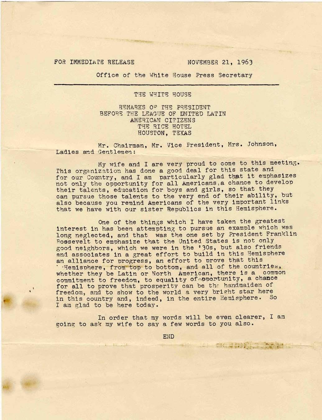 Original White House press release dated 21 November 1963, the day before President Kennedy's assassination. Entitled, ''Remarks of the President Before the League of United Latin American Citizens'' at the Rice Hotel in Houston. 8.5'' x 11'' document is toned and stained in various places, else very good condition.