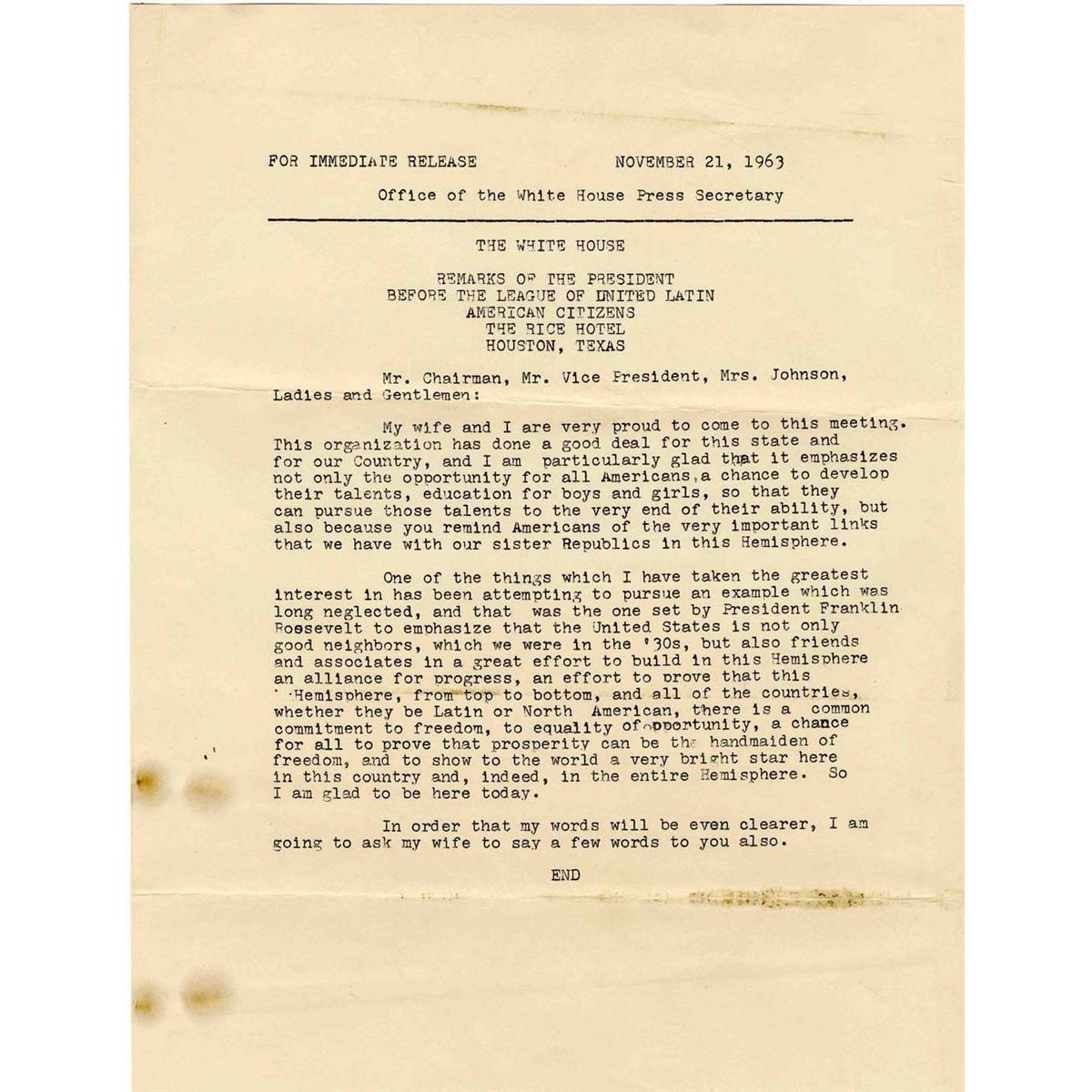 Original White House press release dated 21 November 1963, the day before President Kennedy's assassination. Entitled, ''Remarks of the President Before the League of United Latin American Citizens'' at the Rice Hotel in Houston. 8.5'' x 11'' document is toned and stained in various places, else very good condition.
