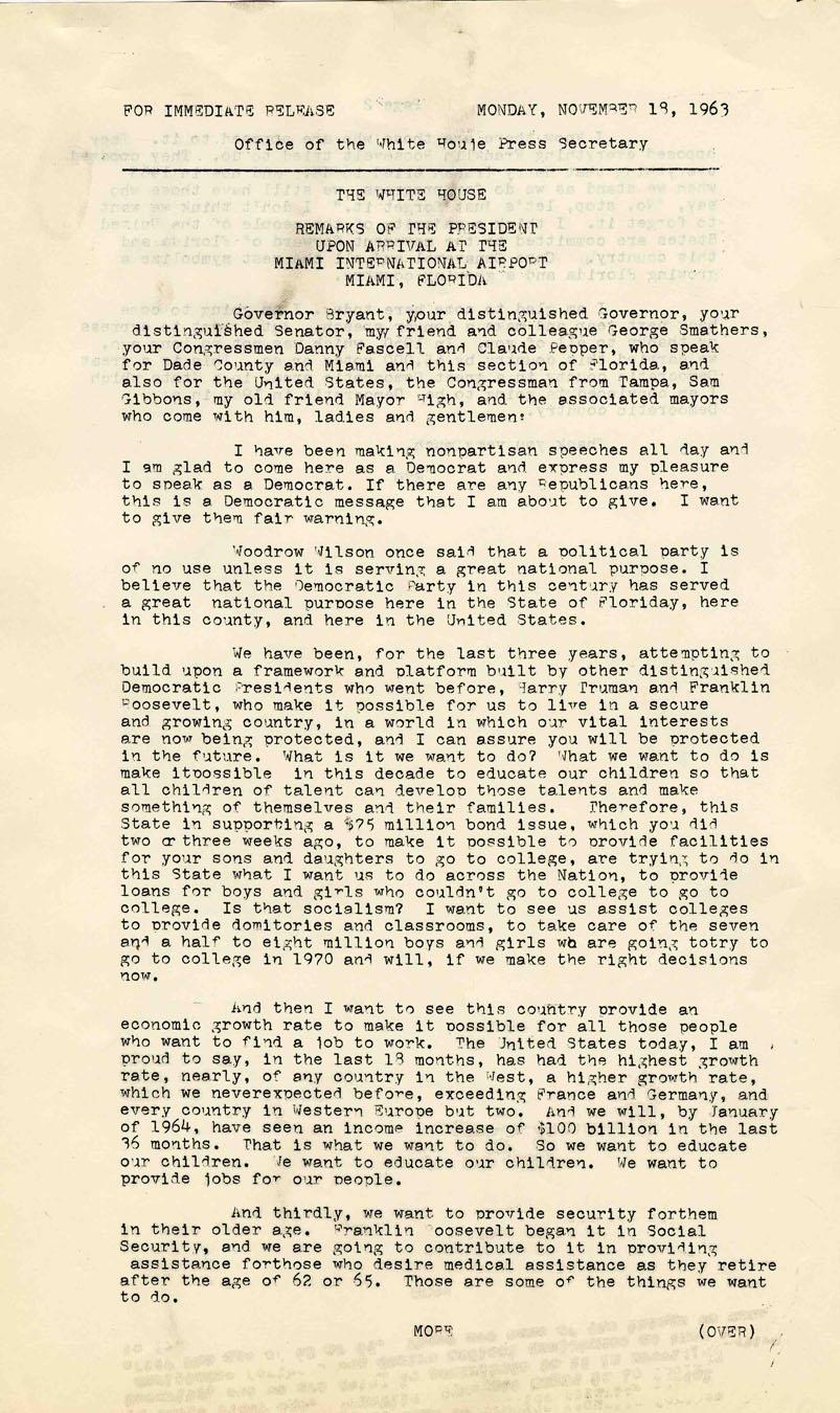 Original press release from the JFK administration dated 18 November 1963 just days before his assassination. Kennedy delivers remarks upon arriving in Miami to fellow Democrats, ''…This State [Florida] in supporting a $75 million bond issue…to make it possible to provide facilities for your sons and daughters to go to college, are trying to do in this State what I want us to do across the Nation…Is this socialism?…'' 8.5'' x 14'' two-page document is lightly smudged with newspaper print, otherwise fine.