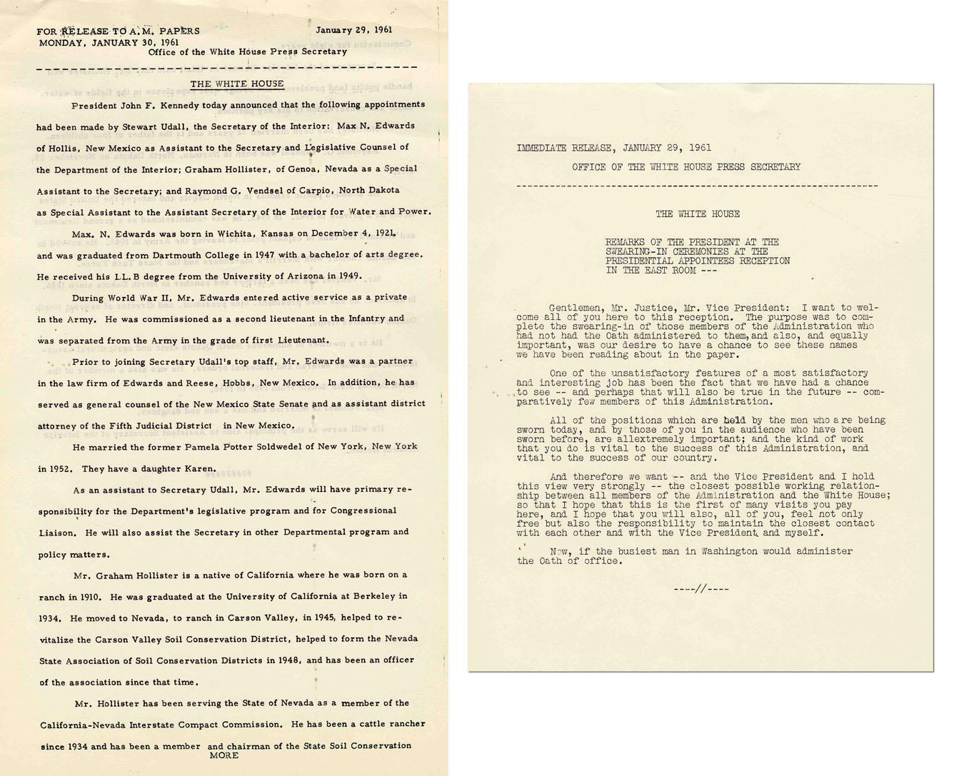 Two original documents from the office of the White House Press Secretary from the Kennedy administration, dated 29 January 1961, just a week after JFK's inaugural ceremony. First item announces the names of official Presidential appointments and lists their bios. Second item is remarks by the President at the appointees' ceremony. Two pages measuring 8.5'' x 14'' and 8.5'' x 11'' respectively. Minor creasing along top edges, else fine condition.