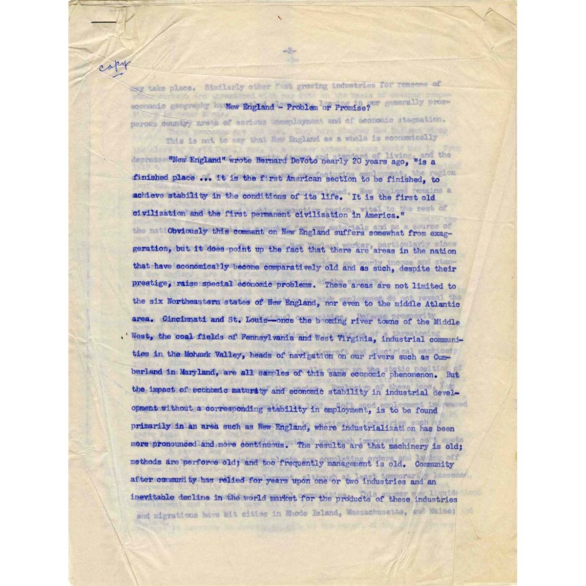 Original copy of Senator John F. Kennedy's speech, ''New England - Problem or Promise?'' The speech reads in part, ''…Clearly New England cannot oppose to industrial development of any other sections of the country, nor can it shrink from competition with other areas. But we believe that such competition should be fair…'' Thirteen pages on 8'' x 11.5'' carbon sheets. Light wrinkling, more severe to first page which also has a small tear in upper right corner. Overall very good condition. From the Robert L. White JFK collection.