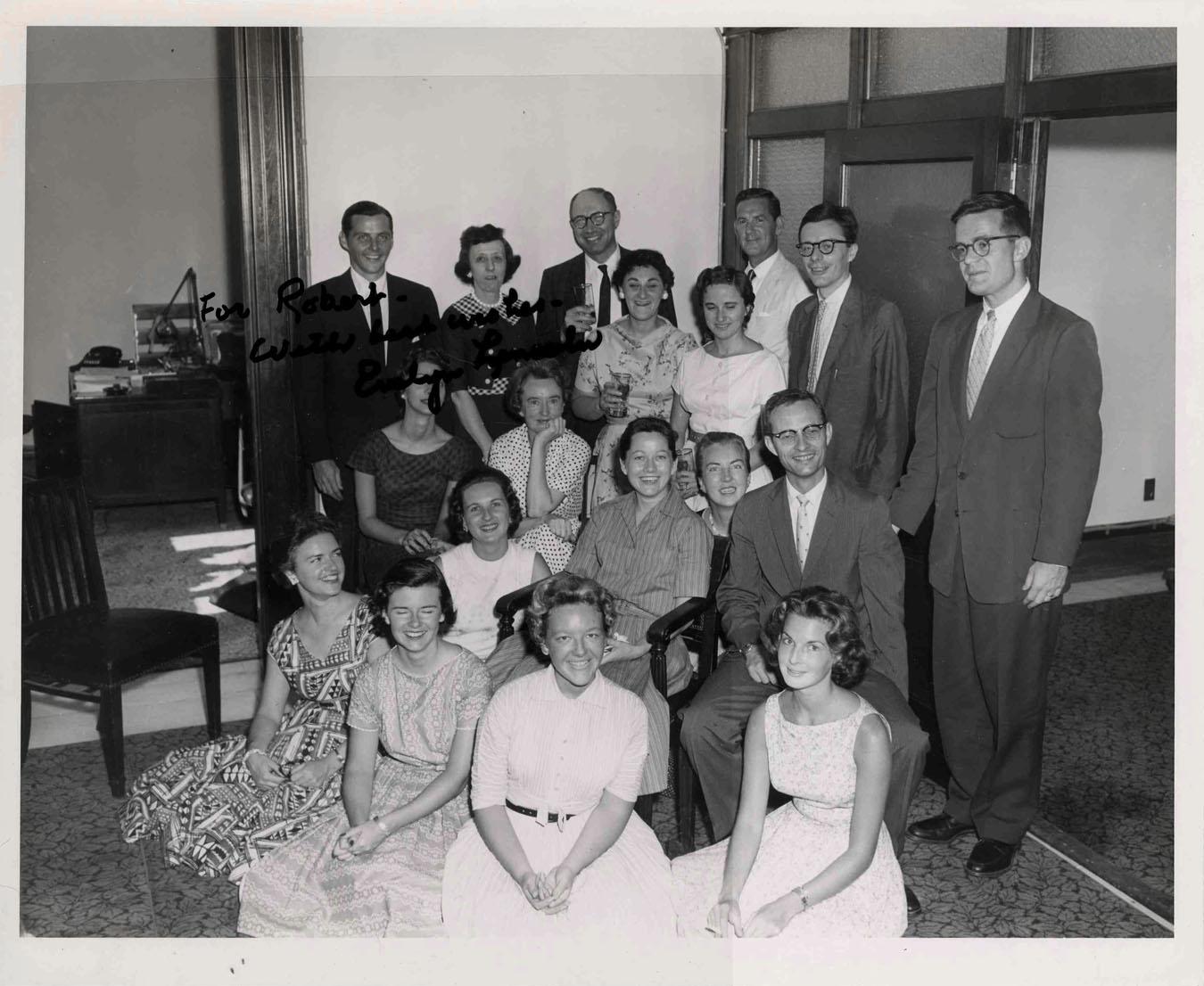 Original photograph of John F. Kennedy's Senate staff, inscribed by Evelyn Lincoln, ''For Robert - With best wishes - Evelyn Lincoln.'' Stamped with the number sequence 2 / 9931 to back. Glossy, black and white photo measures 10'' x 8''. Fine condition.