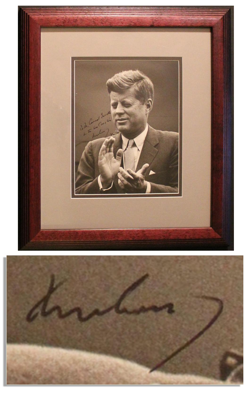 Stunning and rare John F. Kennedy 8'' x 10'' signed photo, showing JFK with a focused gaze applauding, likely as President based on his appearance. Inscription in black ink reads: ''To Dr. Conrad [?] With best wishes John Kennedy''. Matte photo has minor creasing to corners, else near fine. Framed to an overall size of 15'' x 17''. A very attractive and rare signed photograph of the iconic President.