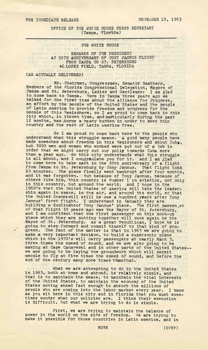 Original transcript of one of President Kennedy's final speeches delivered on 18 November 1963 in Tampa, Florida. JFK commemorates the 50th anniversary of aviation pioneer Tony Jannus' flight from Tampa to St. Petersburg: ''Because of Tony Jannus, this country is Number 1 in aviation. I hope in the 1960's that the United States of America will take the leadership again in space.'' Two page document measures 8'' x 14'' and has light toning and creasing, else near fine.