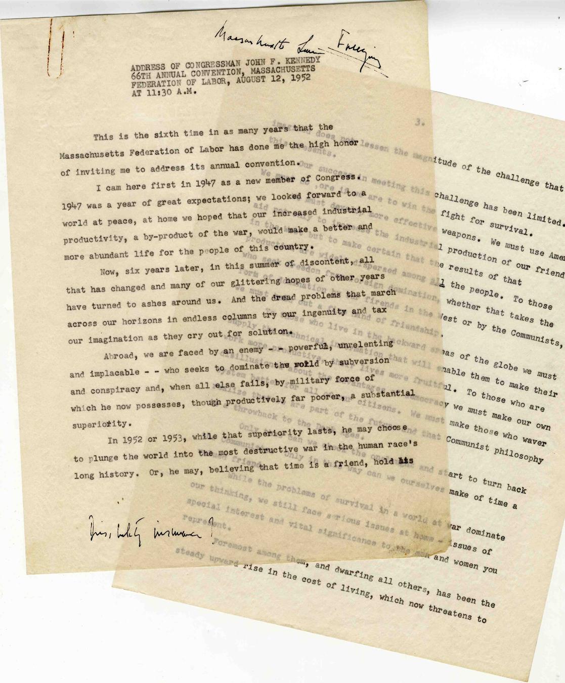 Very scarce notated speech by John F. Kennedy to the Massachusetts Federation of Labor. First page of speech dated 12 August 1952 with notes in JFK's hand: ''Massachusetts'' followed by two illegible words, one underlined -- perhaps a person's name, and then ''Disability insurance ?''. Speech is further rare in the fact that JFK was a U.S. Congressman at the time and delivered this speech while campaigning for office of Senator for Massachusetts, which he achieved in November 1952. Speech reads in part, ''…I cam [sic] here first in 1947 as a new member of Congress. 1947 was a year of great expectations; we looked forward to a world at peace…Now, six years later, in this summer of discontent, all that has changed and many of our glittering hopes of other years have turned to ashes around us…Abroad, we are faced by an enemy -- powerful, unrelenting and implacable -- who seeks to dominate the world by subversion and conspiracy and, when all else fails, by military force of which he now possesses…a substantial superiority…To those who are disillusioned about the advantages of democracy we must make our own system better for all of our citizens…'' Lot comprised of page one and three of the speech, lacking the other pages. Otherwise in exceptional condition, with only a paper clip rust mark to upper left corner. Pages measure 8.5'' x 11''. A truly unique item, perfect for framing.