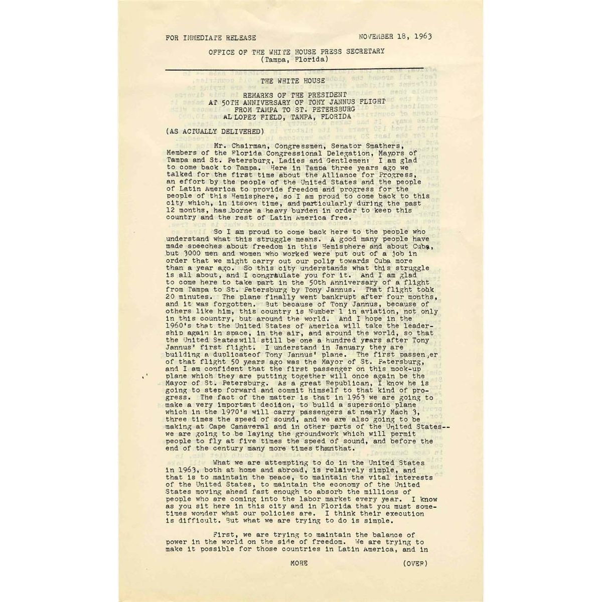 Original press release with transcript of one of President Kennedy's final speeches delivered 18 November 1963. In Tampa, Florida, JFK commemorated the 50th anniversary of aviation pioneer Tony Jannus' flight from Tampa to St. Petersburg. Excerpts from the speech include, ''...Because of Tony Jannus, this country is Number 1 in aviation. I hope in the 1960's that the United States of America will take the leadership again in space...'' Two pages on single sheet measures 8'' x 14''. Light toning and creasing, else near fine.