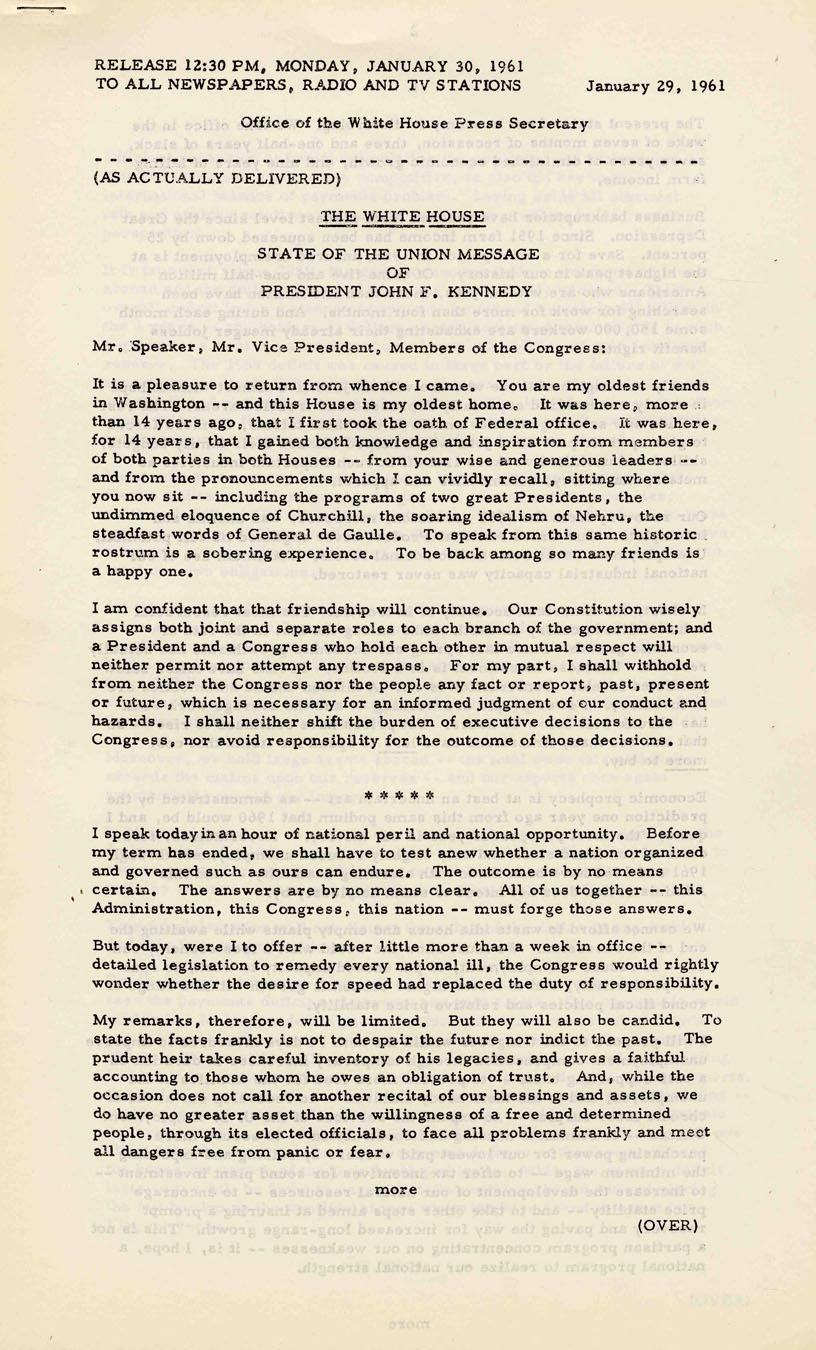 Original press release from the JFK administration giving reporters a transcript of John F. Kennedy's first State of the Union address. Dated 29 January 1961. Historic address reads in part: ''…I speak today in an hour of national peril and national opportunity. Before my term has ended, we shall have to test anew whether a nation organized and governed such as ours can endure. All of us together must forge those answers…'' Ten pages on five sheets measure 8'' x 14''. In near fine condition.