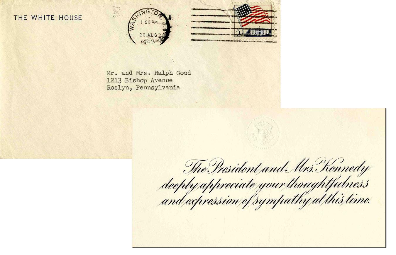 Official printed thank you card sent by President Kennedy and First Lady Jacqueline after the death of their youngest son, Patrick Bouvier Kennedy, who died on 9 August 1963, just two days after his premature birth. White House envelope included is postmarked 20 August 1963 and is addressed to a Mr. and Mrs. Ralph Good. Card reads: ''The President and Mrs. Kennedy deeply appreciate your thoughtfulness and expression of sympathy at this time.'' Card measures 6'' x 3.5'' with an official blindstamped seal at top. Fine condition.