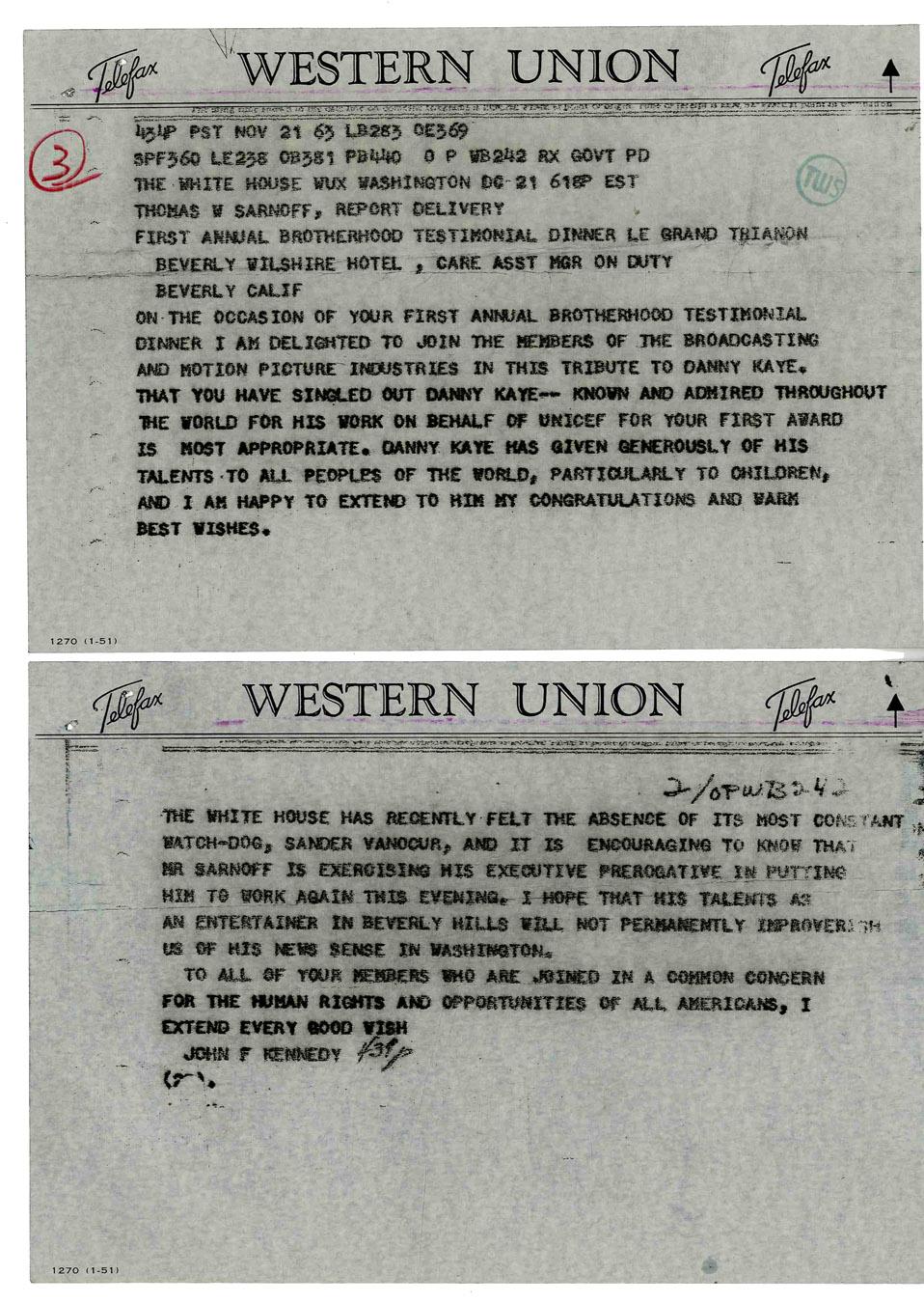 President John F. Kennedy telegram, dated 21 November 1963, 6:18pm while campaigning in Texas -- and likely the last letter sent before his assassination the very next day. Western Union ''Telefax'' telegram was officially sent from the White House and is addressed to television executive Thomas W. Sarnoff with a headline reading: ''First Annual Brotherhood Testimonial Dinner Le Grand Thianon Beverly Wilshire Hotel, Care Asst MGR on Duty Beverly Calif''. Telegram sends congratulations to actor Danny Kaye who was being honored at a tribute dinner. Reads: ''On the occasion of your first annual brotherhood testimonial dinner I am delighted to join the members of the broadcasting and motion picture industries in this tribute to Danny Kaye. That you have singled out Danny Kaye -- known and admired throughout the world for his work on behalf of UNICEF for your first award is most appropriate. Danny Kaye has given generously of his talents to all peoples of the world, particularly to children, and I am happy to extend to him my congratulations and best wishes. The White House has recently felt the absences of its most constant watch-dog, Sander Vanocur, and it is encouraging to know that Mr. Sarnoff is exercising his executive prerogative in putting him to work again this evening. I hope that his talents as an entertainer in Beverly Hills will not permanently improverish [sic] us of his news sense in Washington. To all of your members who are joined in a common concern for the human rights and opportunities of all Americans, I extend every good wish / John F Kennedy''. Telegram measures 6.5'' x 4.5'' on two pages, with staple holes and a few numeric markings, including the number ''3'' circled in red pencil on page one. Near fine condition.