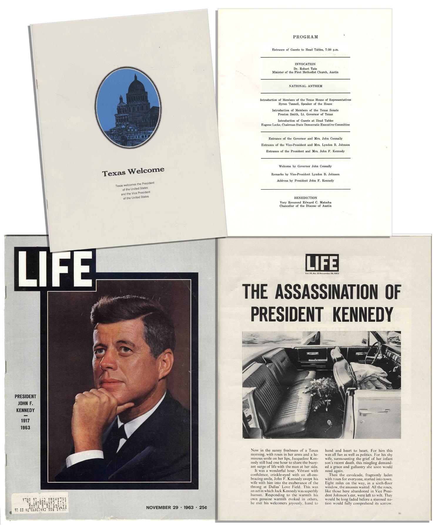 Original ''Texas Welcome Dinner'' program for the Democratic fundraiser scheduled to be held the evening of Kennedy's motorcade through Dallas. Kennedy's itinerary that fateful November day was to attend a luncheon after the motorcade, then head to Austin for his final appearance on the tour. Also includes a 29 November 1963 issue of ''Life'' magazine, which has a .25'' rip to the bottom of front cover and the previous owner's subscription sticker intact, else near fine. Program measuring 8.5'' x 11'' is in fine condition.