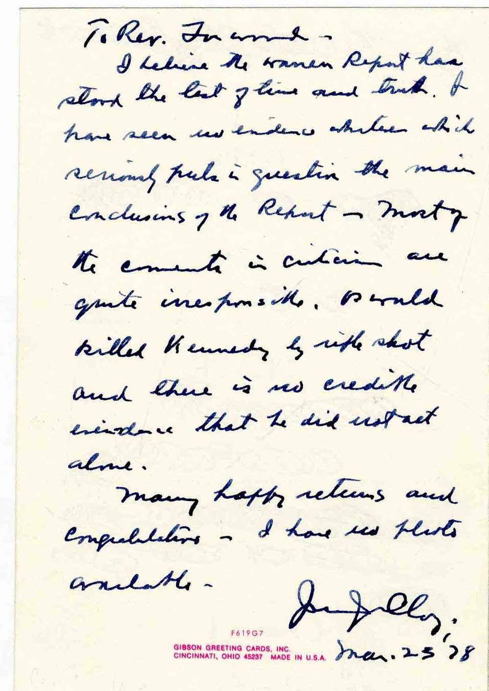 Warren Commission member John J. McCloy autograph letter signed, dated 25 March 1978. McCloy writes ''I believe the Warren Report has stood the test of time and truth. I have seen no evidence...question[ing] the main conclusions...Most of the comments in criticism are quite irresponsible. Oswald killed Kennedy by rifle shot and there is no credible evidence that he did not act alone...John J. McCloy.'' Written on verso of a 3.5'' x 5'' invitation card, the specifics of which have been crossed out. From the Robert White JFK collection.