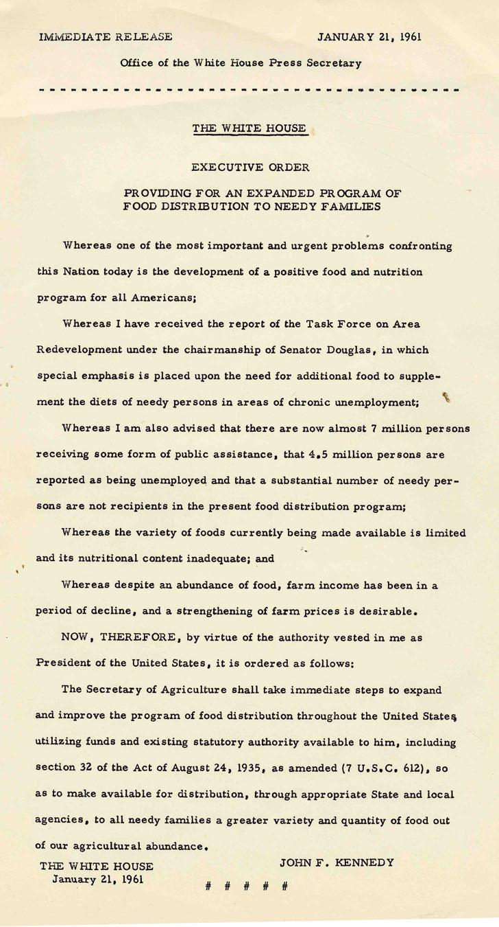 Original press release of John F. Kennedy's first Executive Order, made on his first full day in office as President, dated 21 January 1961. The order mandates an increase in the quantity and variety of foods donated for needy households and reads in part, ''...Whereas the variety of foods currently being made available is limited and its nutritional content inadequate. The Secretary of Agriculture shall take immediate steps to expand and improve the program...'' Document, measuring 8.5'' x 14'' on one page, is in fine condition.