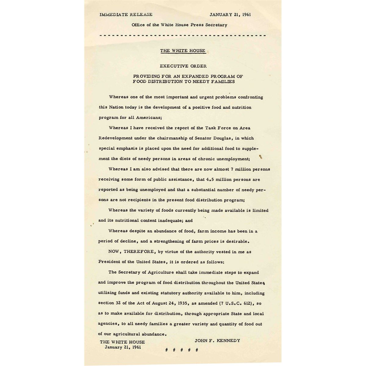 Original press release of John F. Kennedy's first Executive Order, made on his first full day in office as President, dated 21 January 1961. The order mandates an increase in the quantity and variety of foods donated for needy households and reads in part, ''…Whereas the variety of foods currently being made available is limited and its nutritional content inadequate. The Secretary of Agriculture shall take immediate steps to expand and improve the program…'' Document, measuring 8.5'' x 14'' on one page, is in fine condition.