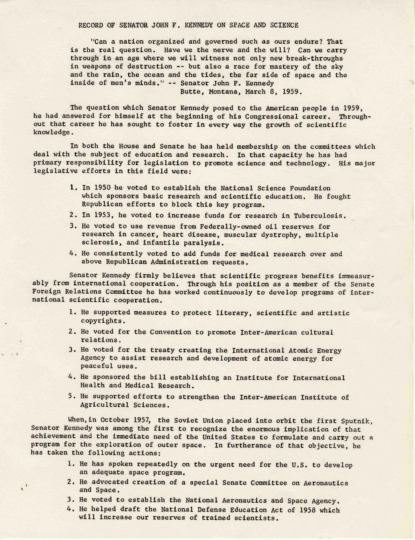 Original document from John F. Kennedy's Senate office. Single page memo outlines Senator Kennedy's record on space and science, quoting him, ''Have we the nerve and the will, in an age where we will witness not only new break-throughs in weapons of destruction -- but also a race for mastery of the sky and the rain, the ocean and the tides, the far side of space and the inside of men's minds.'' Measures 8.5'' x 11''. Near fine condition.