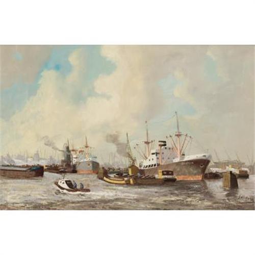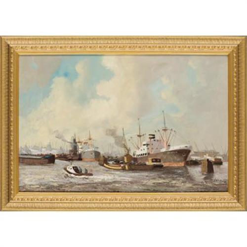 <B>J.H. PETARY (American)</B></I><BR><I>Ships at the Docks</B></I><BR>Oil on canvas<BR>24 x 36 inches (61.0 x 91.4 cm)<BR>Signed lower right: <I>JH Petary</B></I><BR> <B>Condition Report:</B> Original canvas, excellent condition.<BR><BR><b>Shipping:</b> Framed - without Glass, Medium (<a target="_blank" href="http://www.heritageauctions.com/common/shipping.php">view shipping information</a>)