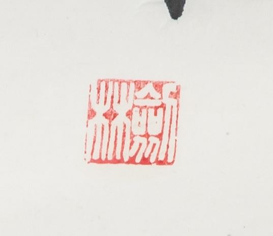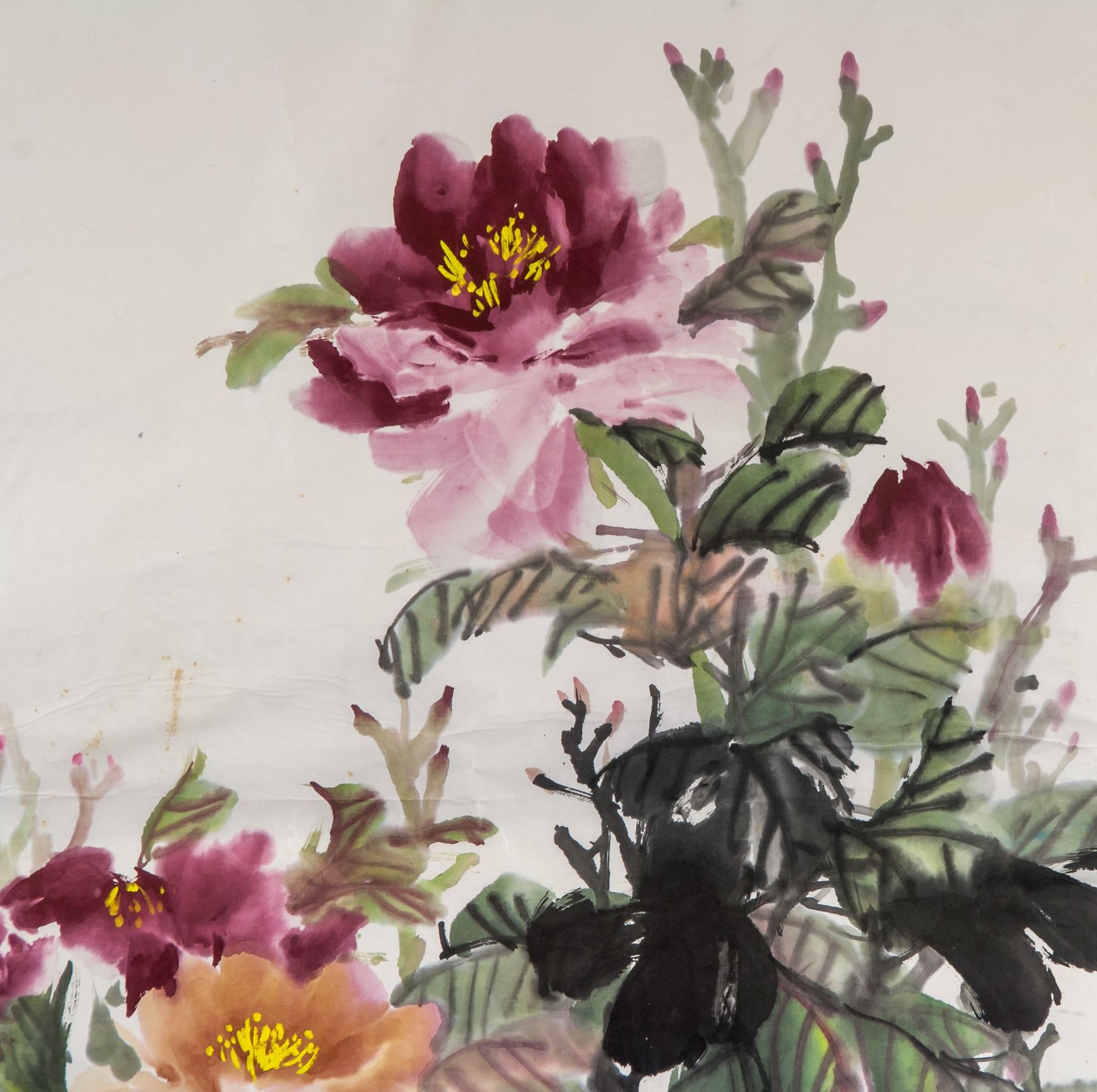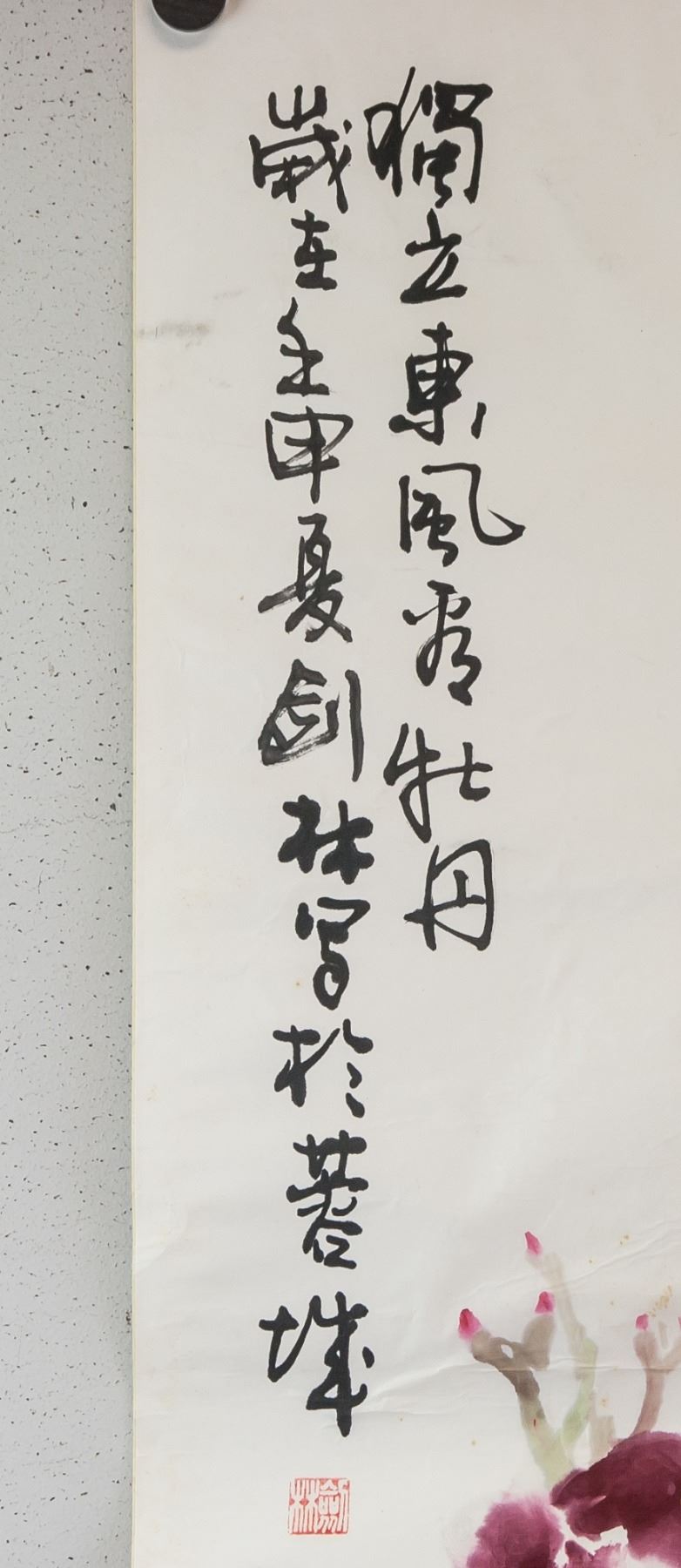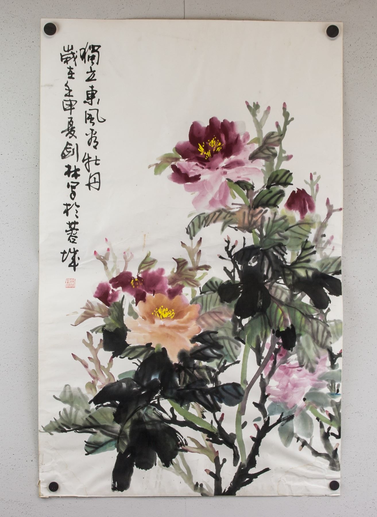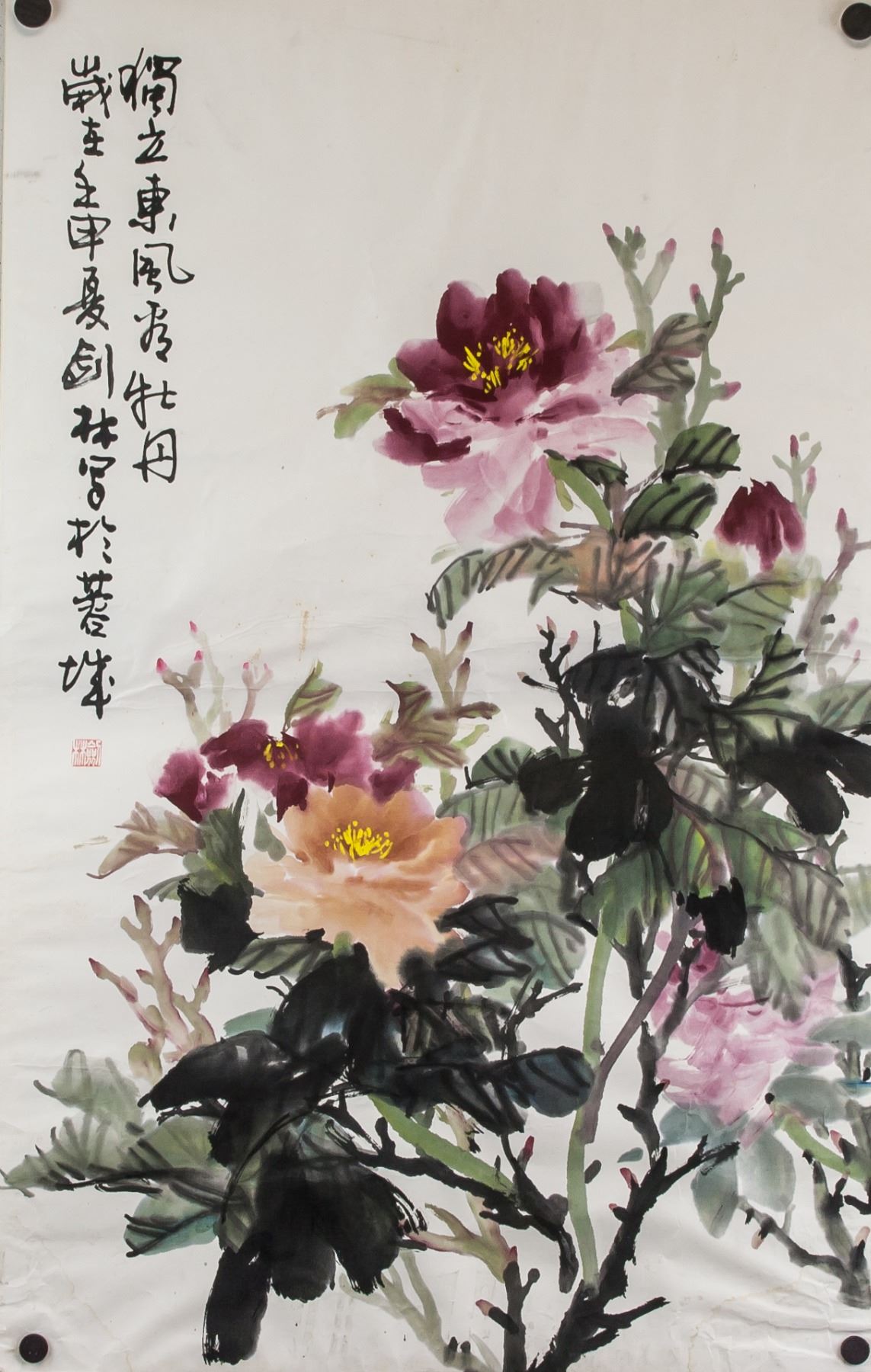Watercolor and ink on paper, featuring peony, signed attr. JIan Lin (Chinese, modern artist), inscribed with 1 artist seal, 94 x 60 cm