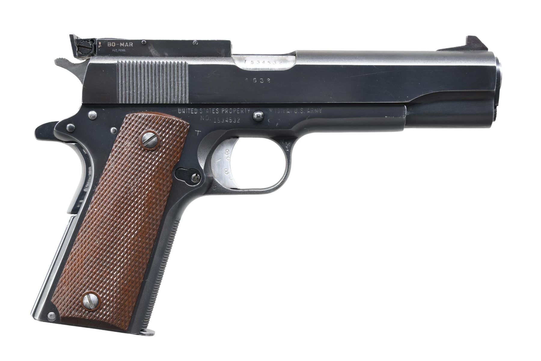 NATIONAL MATCH / REMINGTON RAND 1911A1 SEMI AUTO PISTOL. Cal. 45 ACP. S# 1534532. Jim E Clark was a NRA Bullseye pistol competition shooter till 1975. Clark war the National Pistol Championship in 1958. He was a pistolsmith since 1950 & worn American Pistolsmith of the Year in 1985. This pistol was accurized by him in December 1963 as marked on bottom of slide. This pistol in particular started it's life as a 1944 Remington Rand pistol. After World War II, it most likely remained in military service until 1961 when it was overhaul into a National Match pistol by Springfield Armory as indicated by pistol's features & "SA" stamp on left side of frame. Bottom of slide has "532" matching number, Jim Clark address stamp & "1263" to indicate December 1963 date of customization. This pistol has a custom blued refinish that is matte on top of slide. National Match 5" barrel with matching S# applied & "7790313" part number. Slide has matching "4532" on left side, Patridge serrated front sight & Bo-Mar 2 7/16" base & square notch adjustable rear sight. National Match barrel bushing numbered "4267718". Frame has 1944 Remington Rand markings along with 'NM" on left side of triggerguard bow, "T" stamp on right side of frame & 1 punch mark on right side of frame. Front strap has added checkering. Aluminum National matching triggers with several punch marks on each side. Polished sides of hammer. Grooved flat mainspring housing. Keyes Fiber two piece brown plastic grips with scratch numbered "179" on bottom of right panel. MAGS: 1 - 7 rd. CONDITION: pistol has good reblued finish with handling & cycling wear. Good grips with flattening of diamonds. Shiny bore shows strong rifling. (25-526/MD). CURIO. $1,200-1,800.