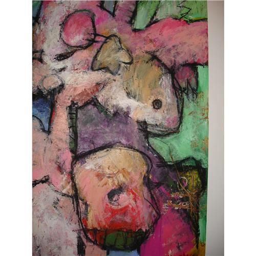 Unconfirmed Title. Two contraposed surreal figures. Boldly signed lower right.Oil on wood panel, 68 x 45 inches