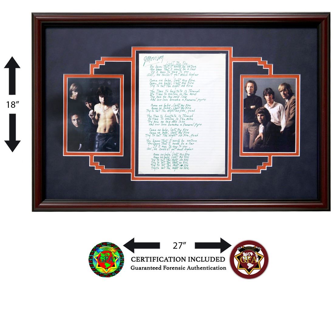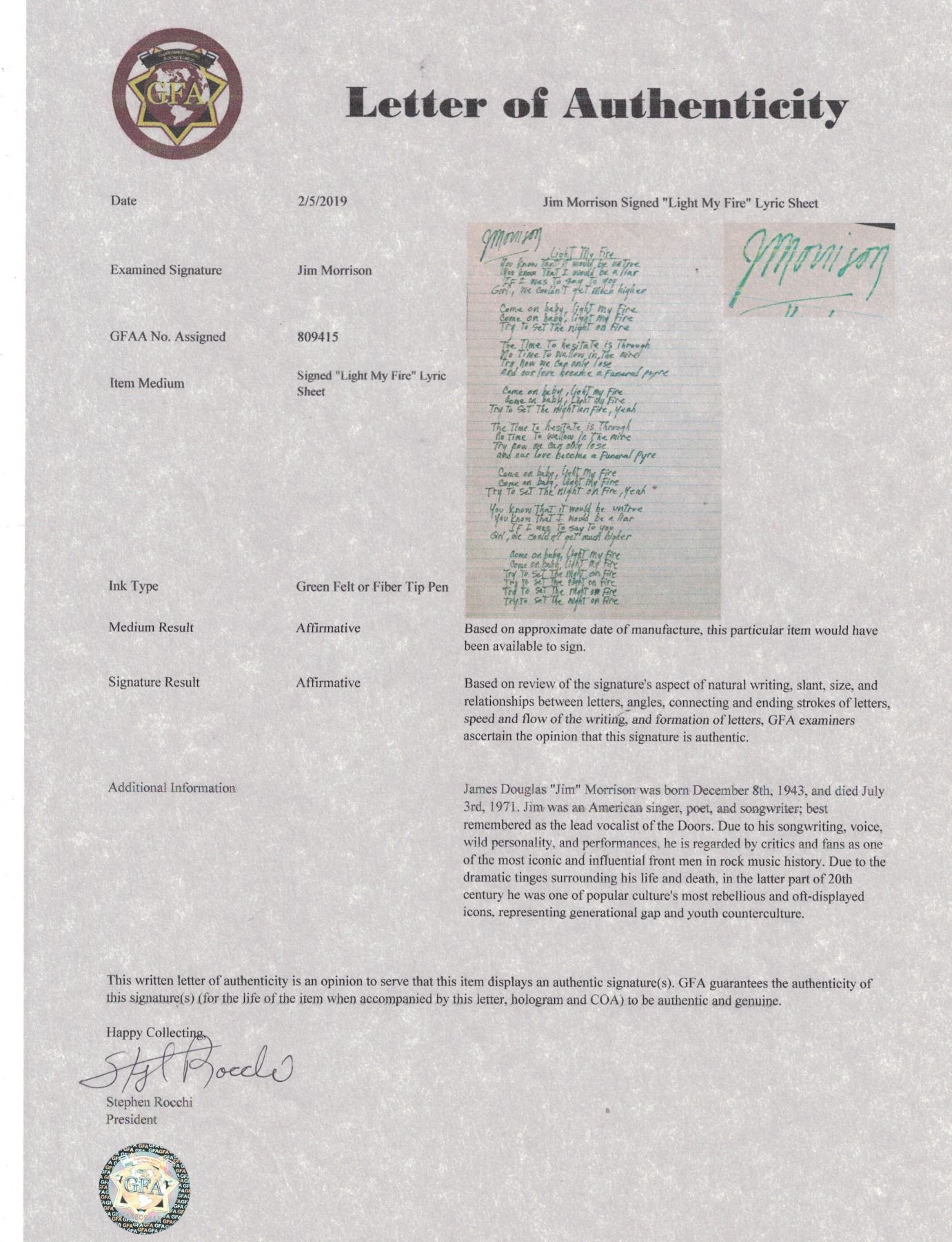 Jim Morrison (December 8, 1943–July 3, 1971). 8.5 x 11 Jim Morrison signed lyric sheet, “Light My Fire" Most of the song was written by Doors guitarist Robby Krieger, who wanted to write about one of the elements: fire, air, earth, and water. He recalled to Uncut: "I was living with my parents in Pacific Palisades–I had my amp and SG. I asked Jim, what should I write about? He said, 'Something universal, which won't disappear two years from now. Something that people can interpret themselves.' I said to myself I'd write about the four elements; earth, air, fire, water, I picked fire, as I loved the Stones song, 'Play With Fire,' and that's how that came about." “Light My Fire was released in January 1967, the song runs 6:50. The group's first single, "Break On Through (To The Other Side)," reached just #126 in America. "Light My Fire" was deemed too long for airplay, but radio stations (especially in Los Angeles) got requests for the song from listeners who heard it off the album. Their label, Elektra Records decided to release a shorter version so they had producer Paul Rothchild do an edit. By chopping out the guitar solos, he whittled it down to 2:52. This version was released as a single in April, and the song took off, giving The Doors their first big hit. Known for his drinking, drug use and outrageous stage behavior, in 1971 Morrison left the Doors to write poetry and moved to Paris, where he presumably died of heart failure at the age of 27. Matted and Framed. Comes with a Letter of Certification from Guaranteed Forensic Authenticators.