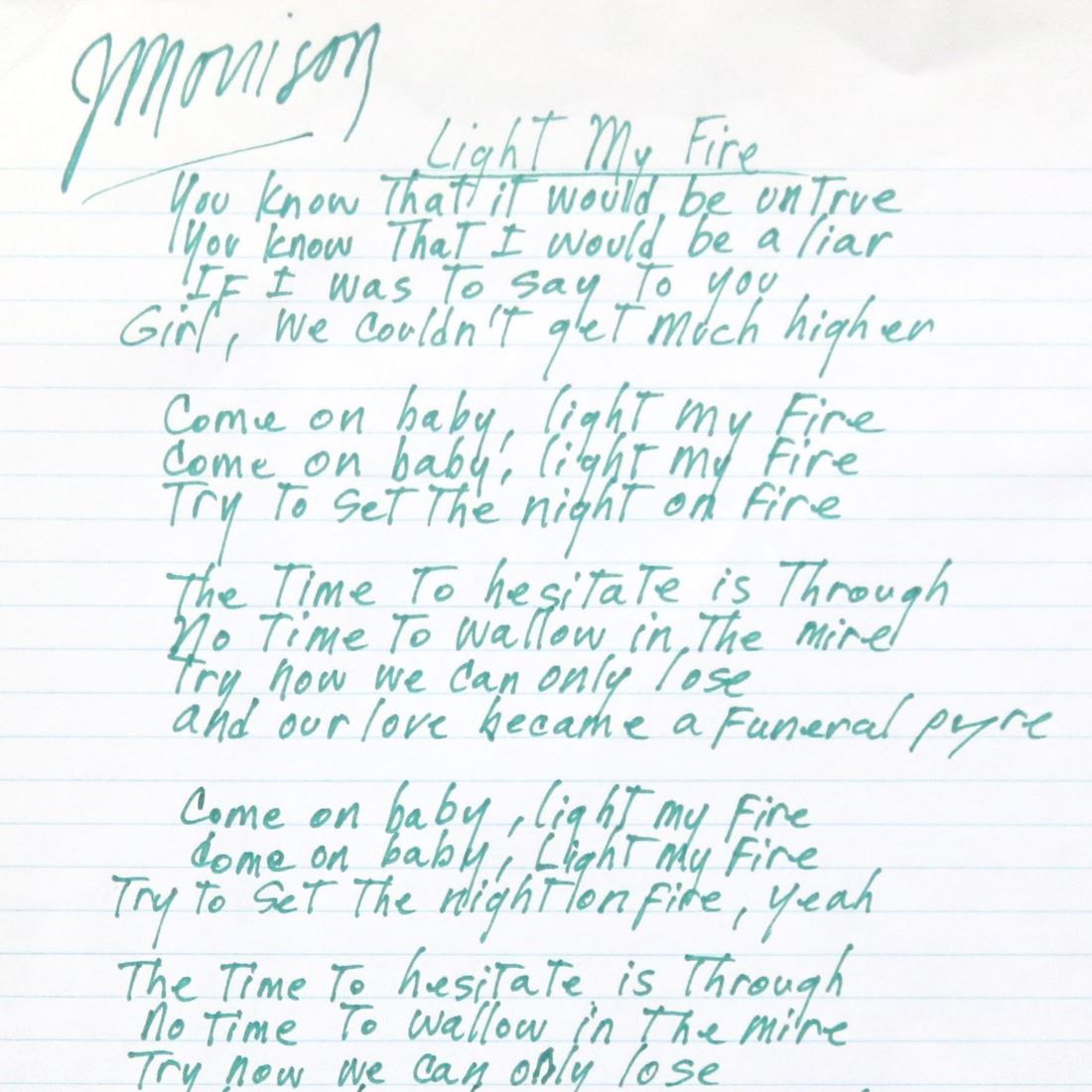 JIM MORRISON SIGNED LYRIC SHEET, “LIGHT MY FIRE”